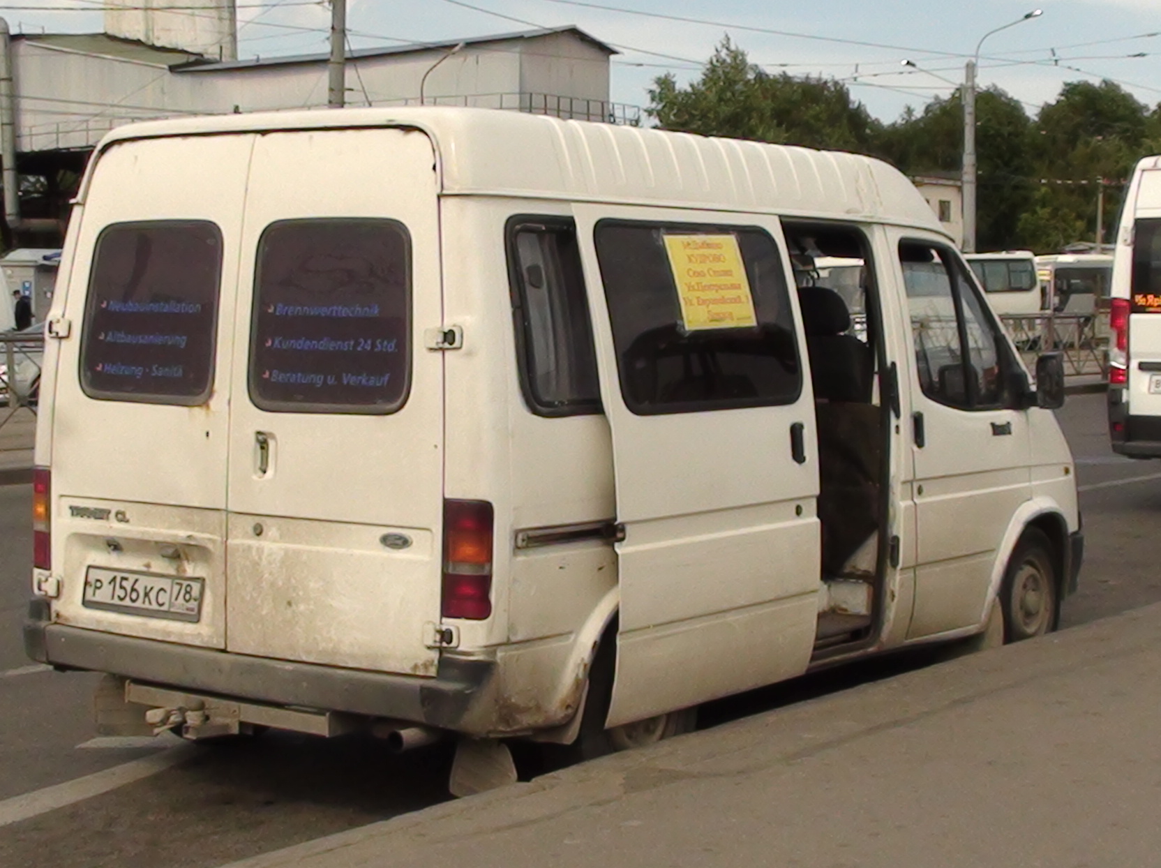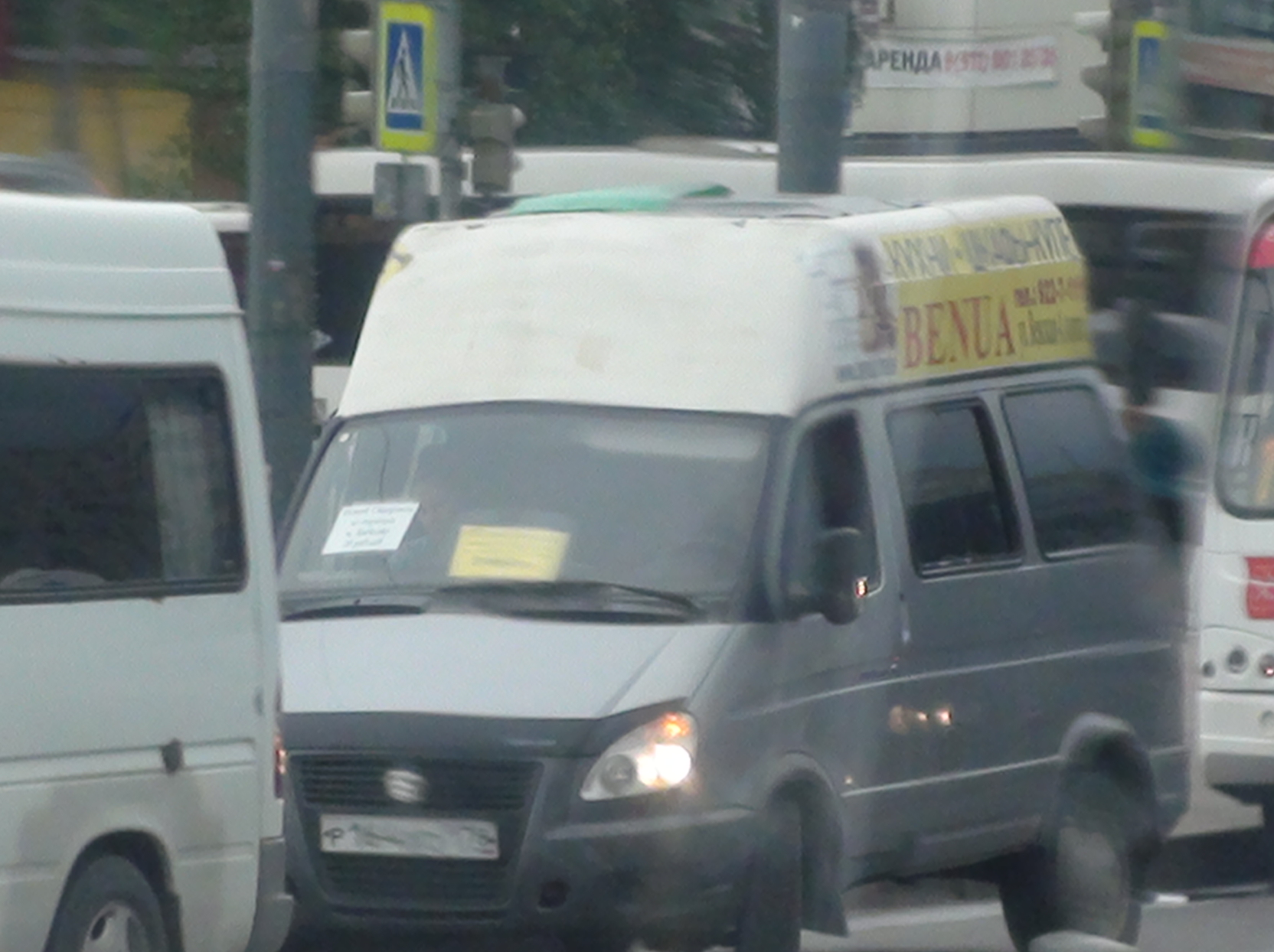 Сегодня-таки обнаружил нелегалов на ГАЗели. Маршрута как такового нет, только бумажка с надписью маршрута следования: "Новый Оккервиль - до переезда - м. Дыбенко, 20 рублей". Попутно зарабатывают на рекламе, расположенной на увеличенной крыше. Сфоткано из кривого окна трамвая.