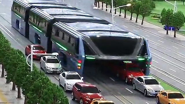 Инновационный автобус позволяет другому автотранспорту проезжать под ним. Транспортное средство передвигается на двух опорах, для которых на дороге установлены специальные рельсы.