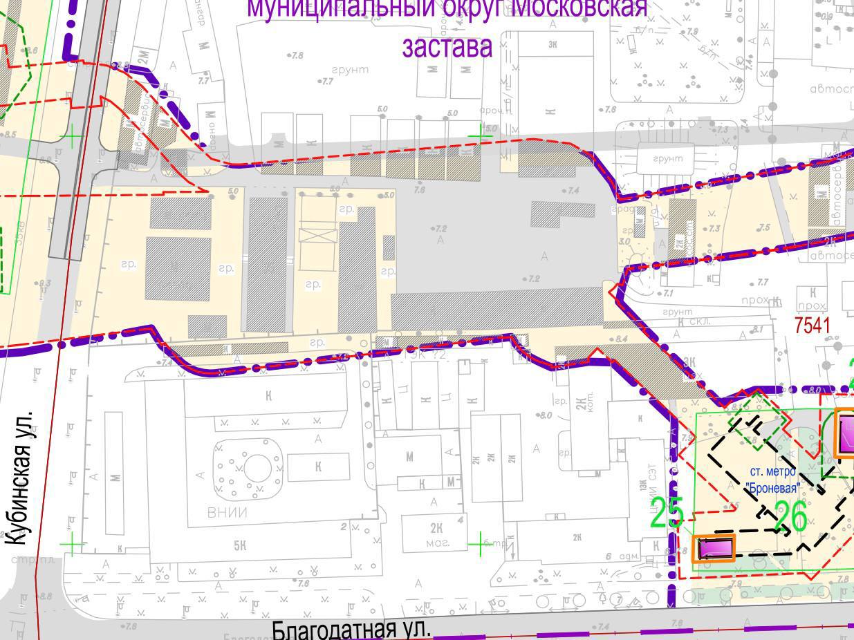 1. Строительная площадка вестибюля № 1 станции «Броневая» по адресу: Санкт-Петербург, Московский район, восточнее здания по адресу: Благодатная улица, дом 6.