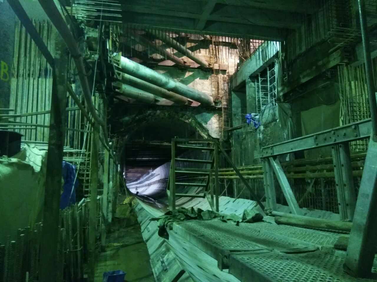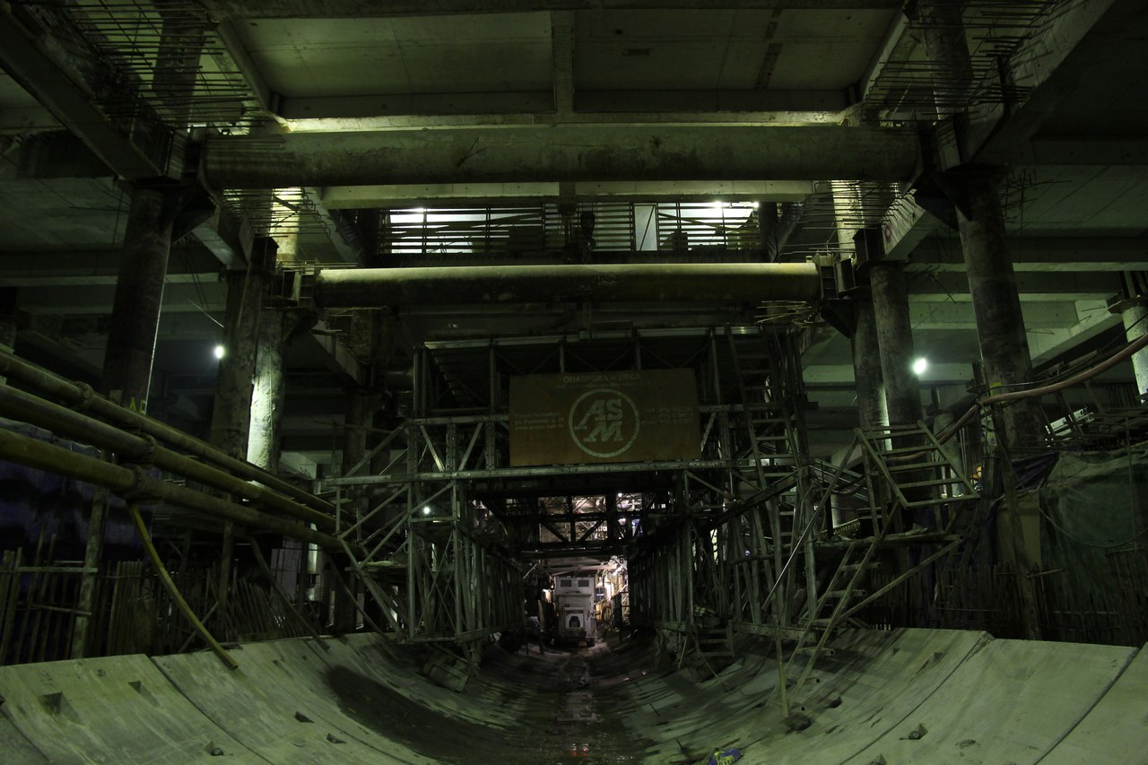 Пару дней назад. Пройденный перегонный тоннель и ТПМК. Много фото по самой станции "Новокрестовская" выложил в соответствующей теме. Последняя тележка щита встала в том месте, где станция расширяется и начинается участок с 4 рядами колонн (6-7 оси).