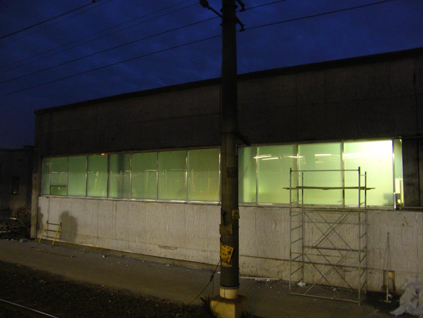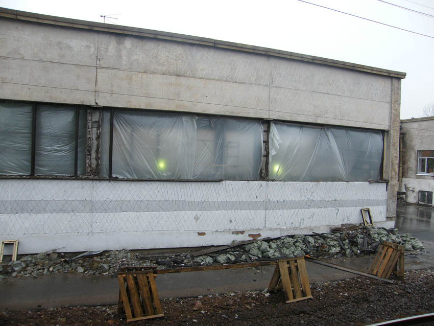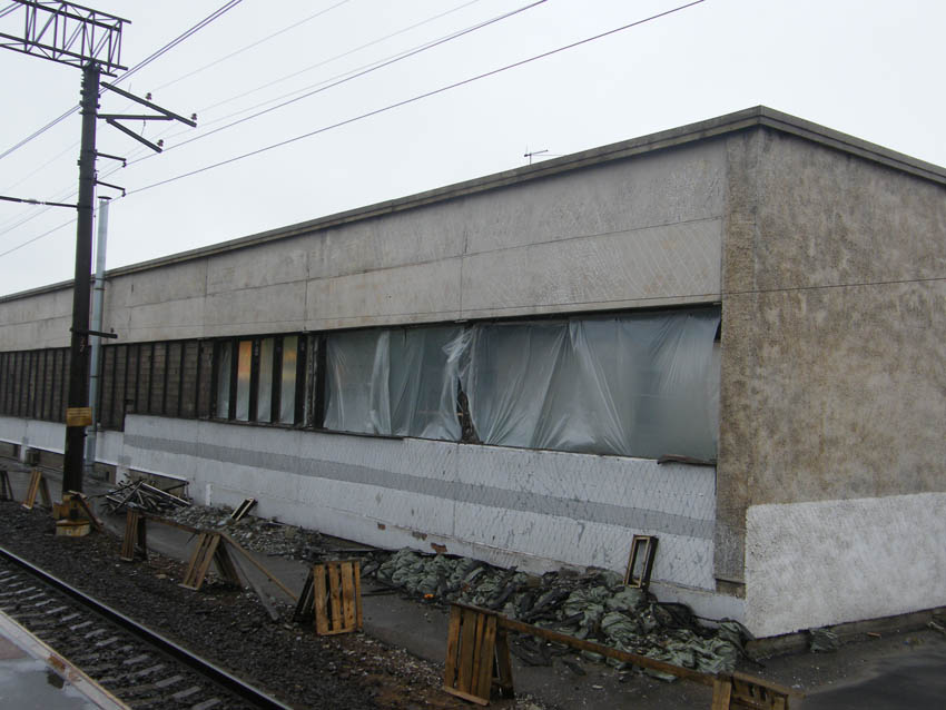 А тем временем начали ремонтировать фасад, выходяший на платформу ж/д: демонтируются стеклоблоки, на стенах делают "насечки" для лучшего последуюшего сцепления штукатурки или каких-либо облицовочных материалов, сверху уже закрепляют штукатурную сетку. Несколько фотографий: Середина здания пока нетронута.