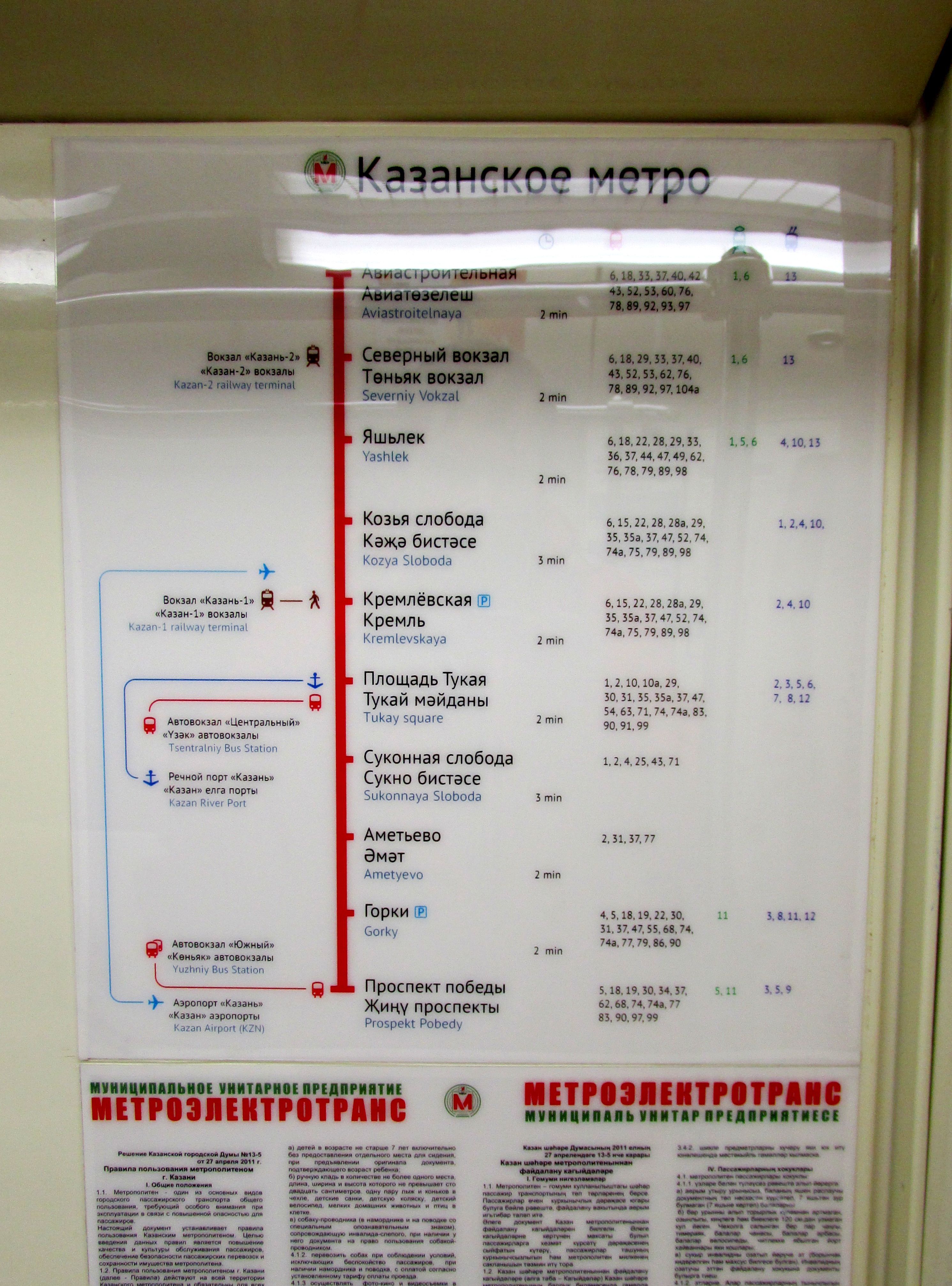 4. Забавляет разноголосие в автоинформаторах (один голос - объявление станции на русском, второй - на татарском, третий - на английском), а в НОТ встречается и 4 голоса: ОДЗ и название следующей станции разными голосами.