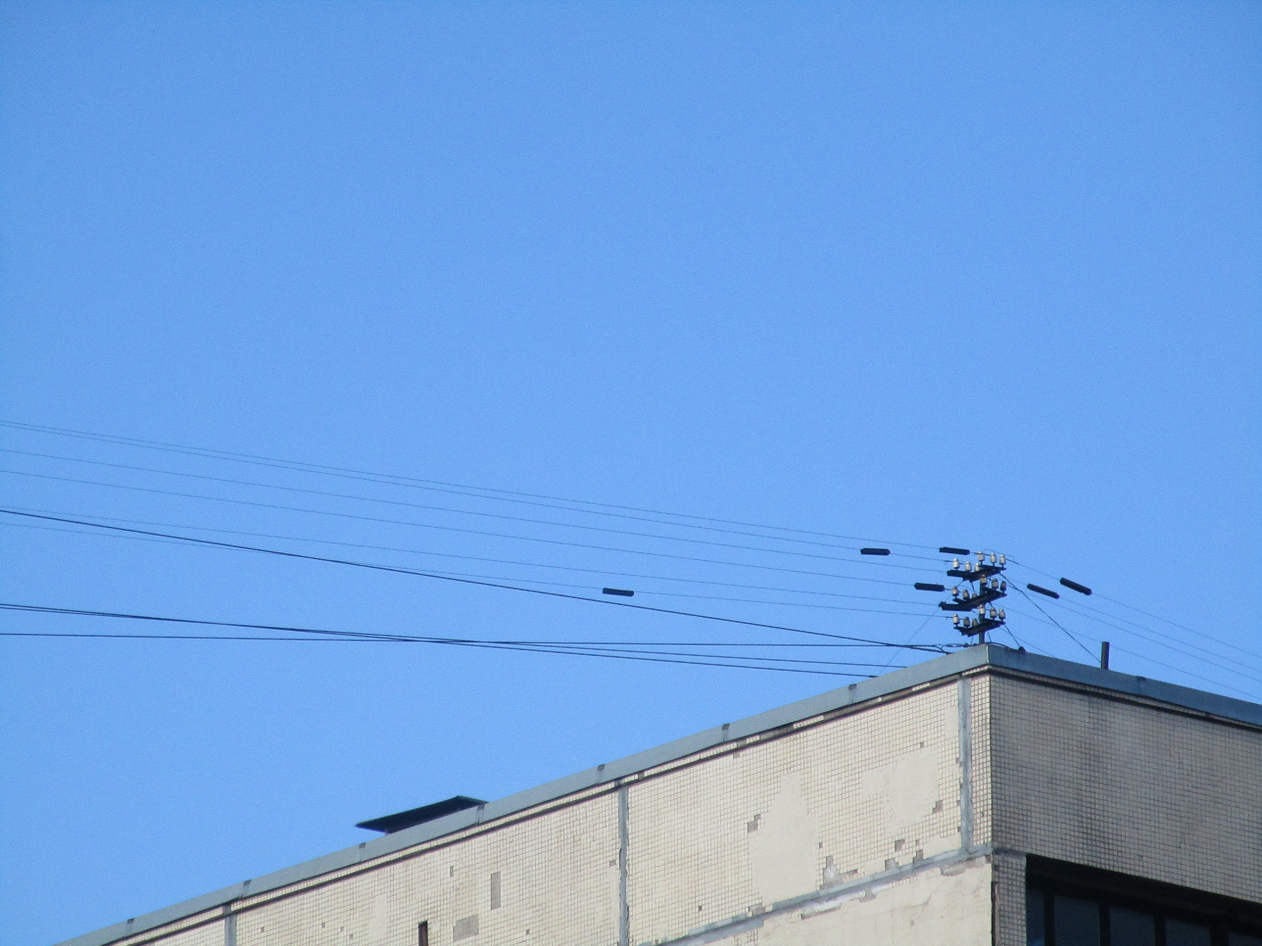 1) прикольная такая антенна на крыше последнего подъезда пятиэтажки на Д. Бедного 14, корп. 2. (фото приложено ниже). Сколько лет я на неё смотрю, а она всё никак не меняется. Уже минимум лет 30 такая. Вот эти чёрные, похожие на стеклярус на нитке хреновины, похоже, из резины, они против замыканий? Больше такого нигде не вижу.