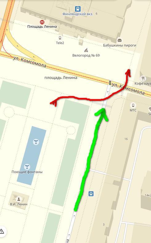 Заметил уже дважды за последние пару месяцев разборки между охранниками и водителями автобусов около Финбана. Ситуация такая: примерно в 9 утра дети/туристы с чемоданами в огромных количествах переходят дорогу от фонтанов к зданию вокзала. Улицу Комсомола перегораживают охранники в фуражках (РЖД?). Пока сотни туристов переходят дорогу на конечной остановке накапливается 4-5-6 автобусов с пассажирами. Водители автобусов справедливо ругаются с этими охранниками. Получается какое-то самоуправство. Перекрывать движение вправе только сотрудники ГИБДД (которых там не было). На скриншоте попытался схематично отобразить потоки (красная линия — это «река» туристов, зелёная — вереница автобусов с пассажирами).