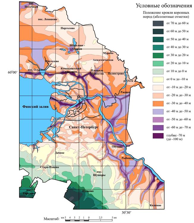 А вот авторитетный источник (Геологический атлас СПб, 2009) говорит, что положение кровли коренных пород в районе Марсового поля не менее -40 метров, а непосредственно у Невы - от -70 до -100 метров.