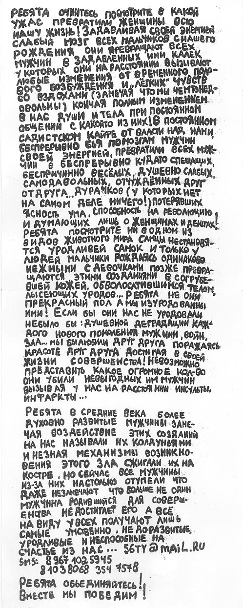 «Ребята! Очнитесь! Посмотрите, в какой ужас превратили женщины всю нашу жизнь!» - так начинается неизвестный автор свой «программный» документ. Буквы написаны пером и чернилами, а затем первоначальный экземпляр размножен на принтере. Видимо, писал мужчина воззвание второпях, грамматических ошибок уйма. Ну, или был несколько не в себе.