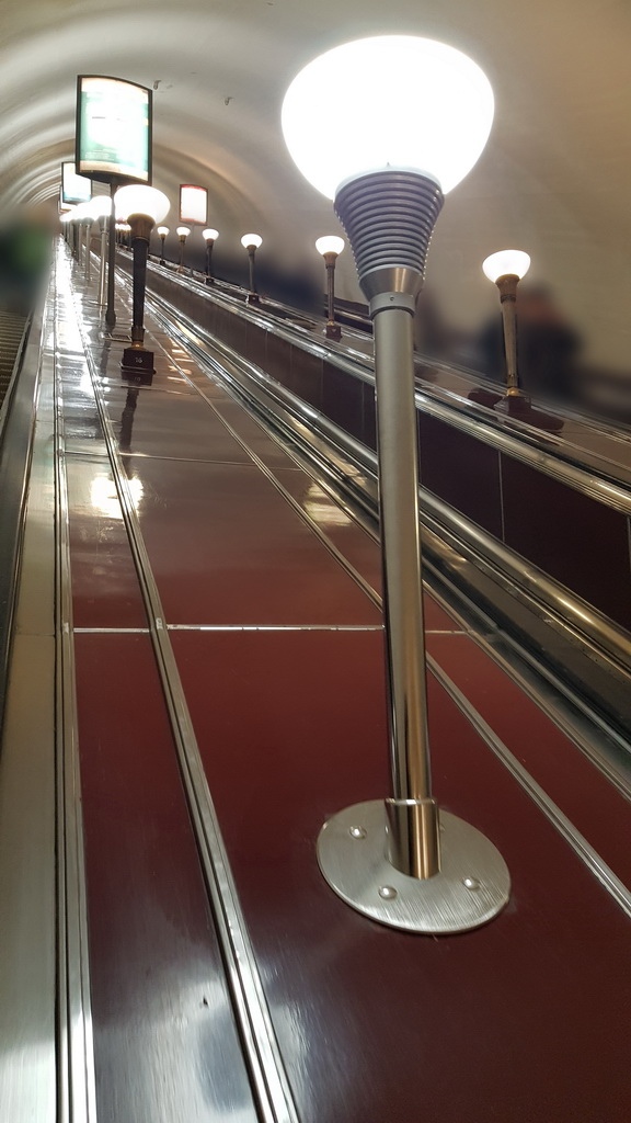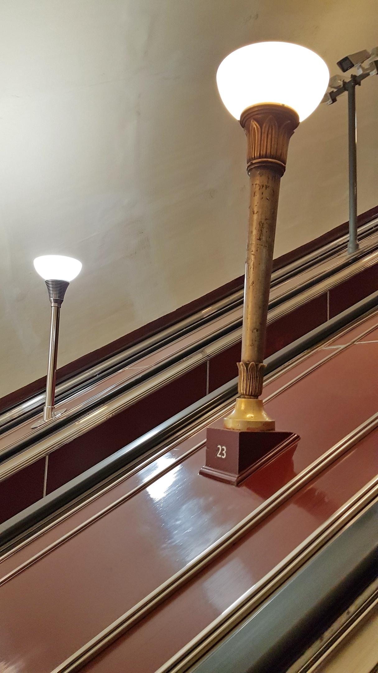 На станции метро "Площадь Ленина" вместо оригинальных светильников бронзового цвета с декором на эскалаторах начали устанавливать новодел из нержавейки.