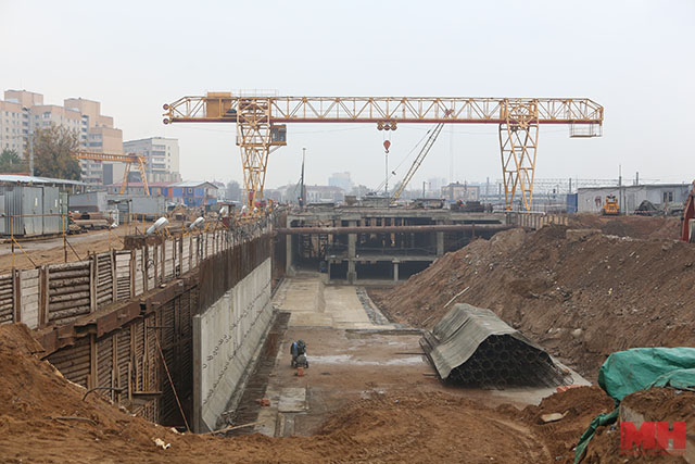 В котловане у нас под ногами – будущая станция «Вокзальная». Уже можно разобрать, где будет платформа, где – пути. Часть платформы – 24 м – построена. Одновременно с сооружением станции ведется проходка тоннеля в сторону станции «Площадь Ленина». Один его выход приведет в существующий вестибюль, второй – на платформу старой станции. Примерно так, как на «Купаловской» и «Октябрьской». Тоннель надо тянуть и под железнодорожными путями, и под одним из зданий БГУ. Все это требует особых технических решений. Однако железнодорожное движение не перекрывается, лишь составы в месте строительства снижают скорость.