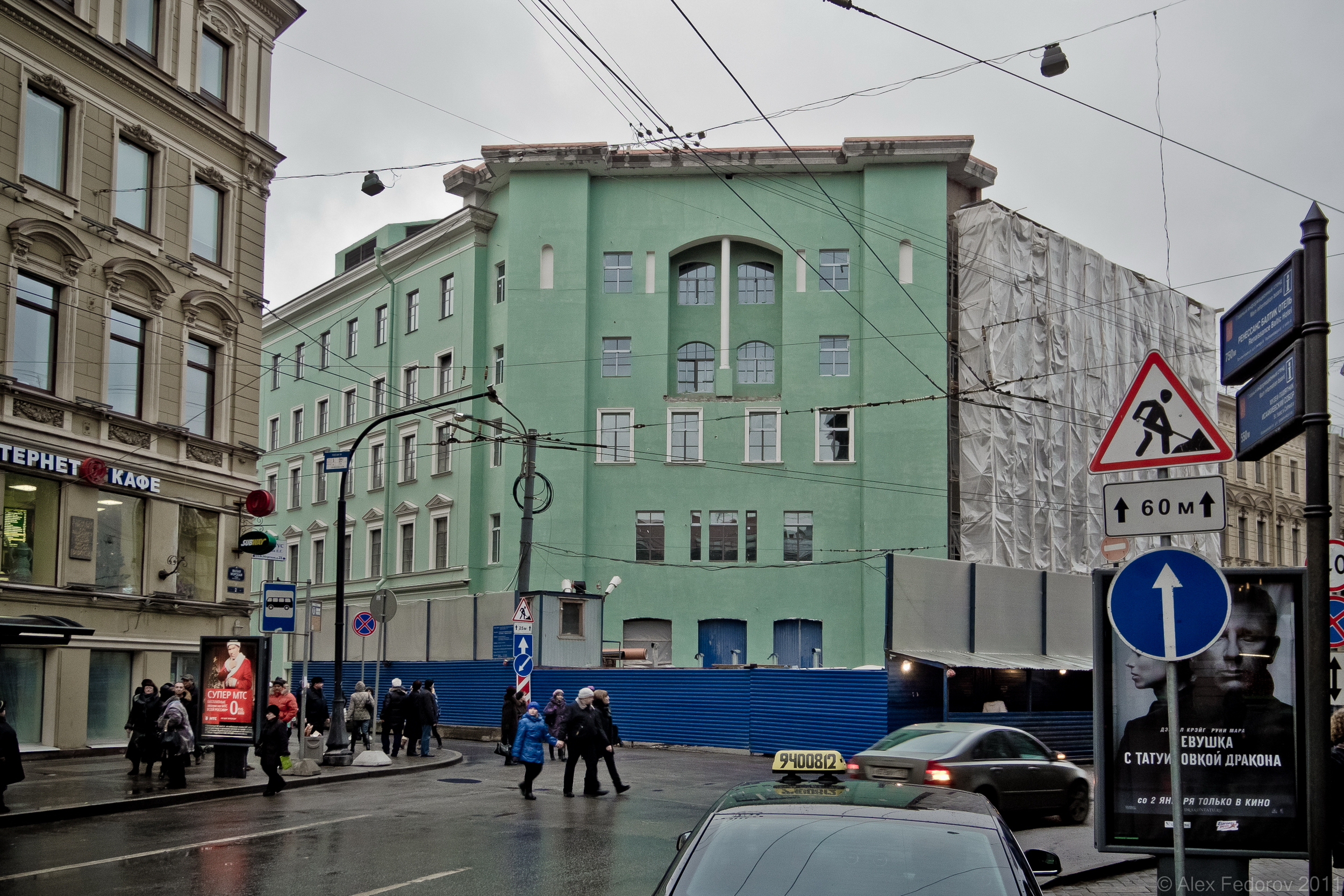 Здание в процессе работы над фасадом. Пока ещё нет лепнины, наличников и карнизов, зато есть один слой краски, которого явно не достаточно, и вентиляционная надстройка с левой стороны, которой раньше не было. :)