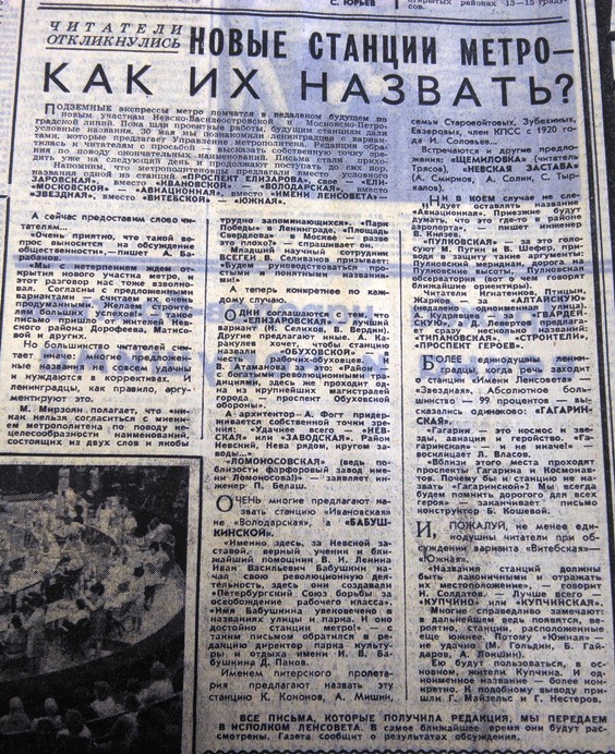 1968 год, так сказать, обсуждение на страницах "Ленинградской правды" новых названий для станций