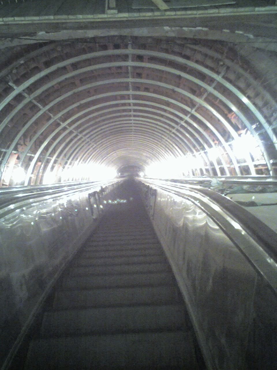 В любом случае, годы прежних уютных своей тесноватостью (все-таки, 3 эскалатора), приятным полумраком (темный цвет ступеней и балюстрад удивительно гармонично сочетался с неярким освещением) и оштукатуренным потолком наклонников, похоже, сочтены. Единого варианта их ремонта в ближайшее время, по-любому, не будет. А значит, будем наблюдать ужас вроде покрашенных половой краской (а-ля салон трамвайного вагона напоследок перед списанием) балюстрад.