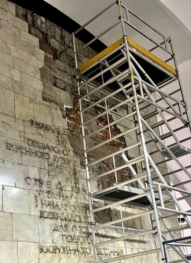 🗿Ильич просто отправился на чистку. Пока специалисты заменяют облицовку стены, барельеф аккуратно по всем правилам отмоют и вернут на место.