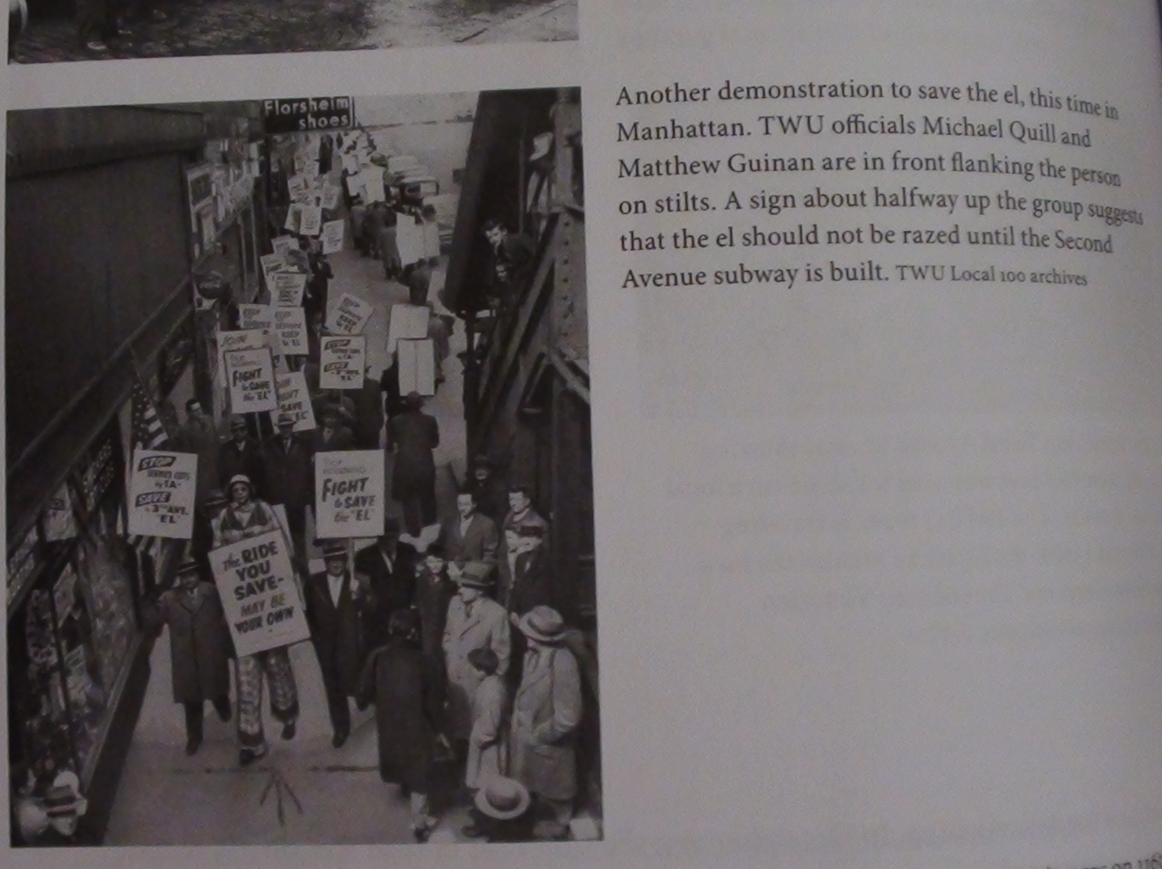 "Ещё одна демонстрация по спасению эстакады на 2-й авеню. В этот раз на Манхеттене. От ТСРТ был Майкл Куилл и Мэтью Гинан, находящиеся на первом плане, Мэтью Гинан на ходулях. На плакатах в середине - предложение сначала построить линию 2-й Авеню, а потом уже разбирать уже имеющуюся".