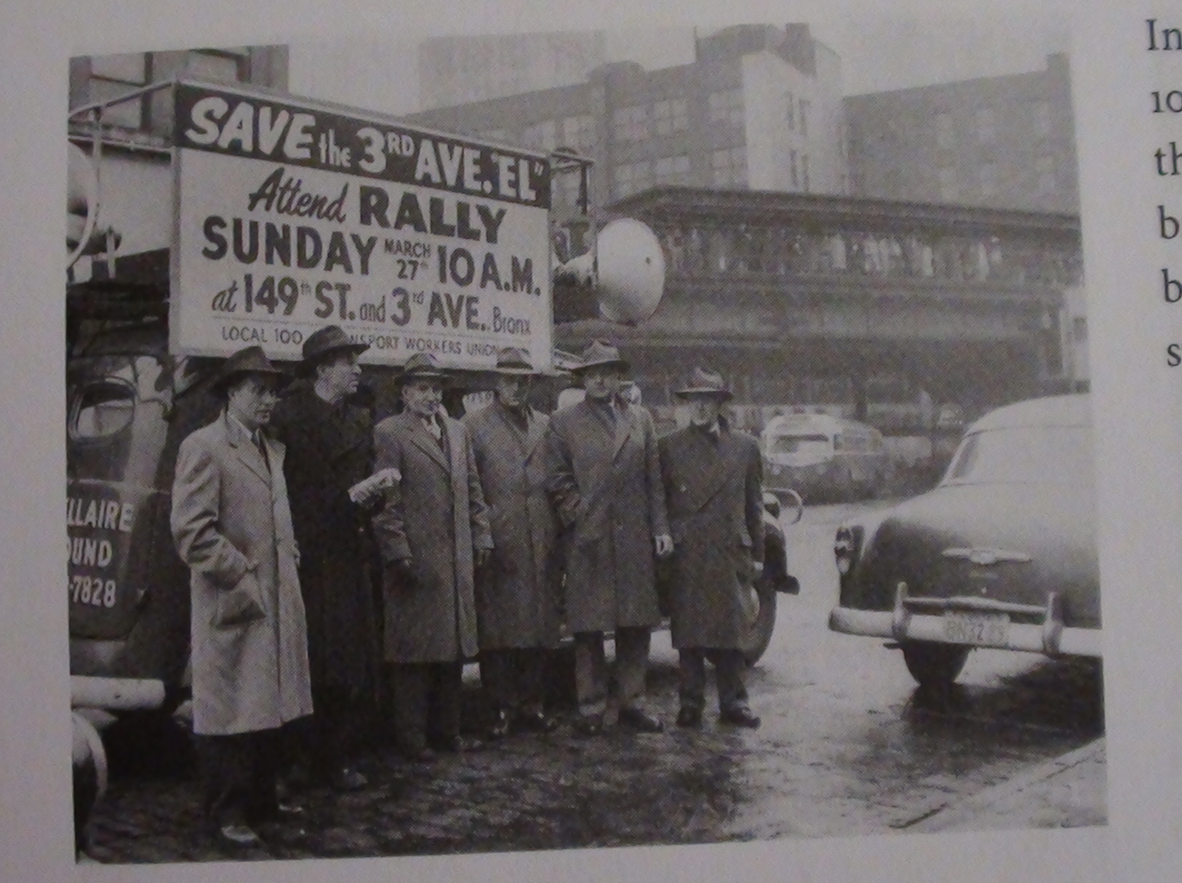 "В марте 1955 года Транспортное Содружество Работников Транспорта вышли на демонстрацию с вывеской "Сохраним эстакаду на 3-й Авеню". На фото - задняя часть станции 149-я стрит, вдоль автобусной станции. Водители автобусов были членами этой ТСРТ, поэтому искренне поддерживали эту демонстрацию.