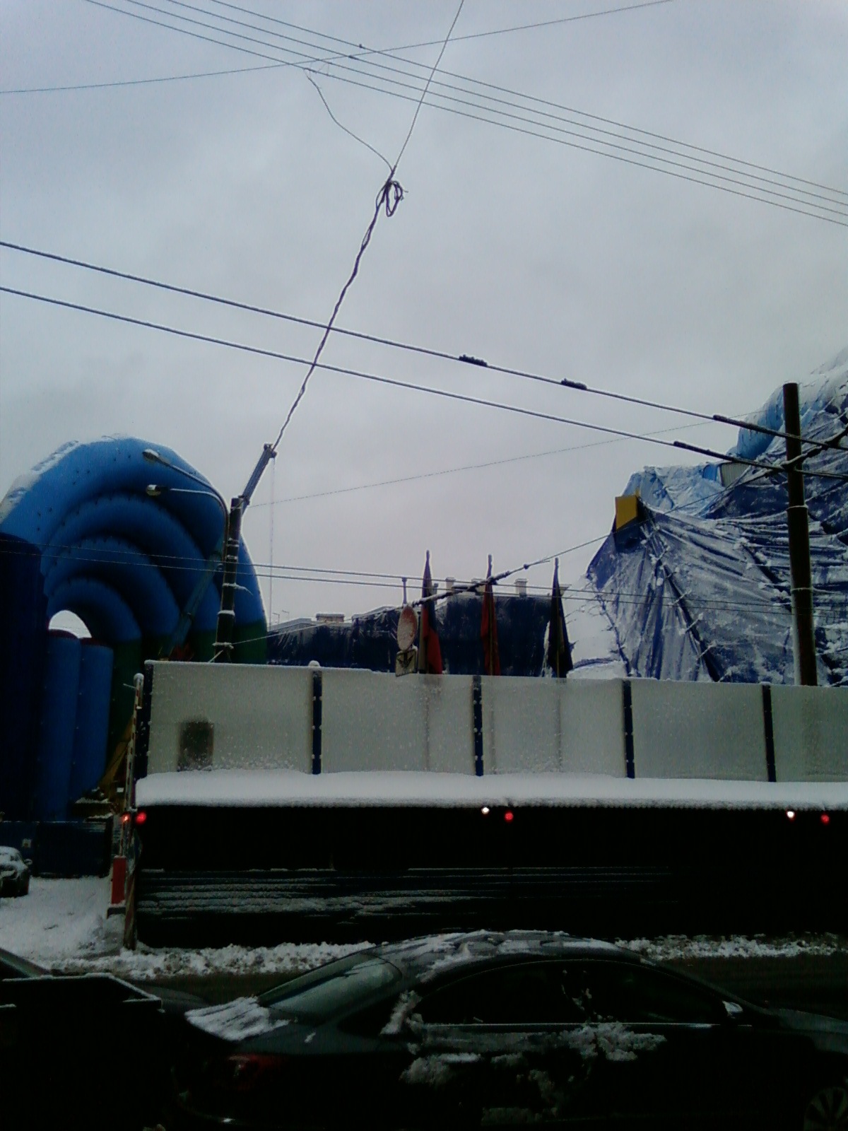 Ночной снегопад повредил надувной шатер, защищающий стройплощадку станции метро "Адмиралтейская", что находится на Малой Морской улице в Петербурге.