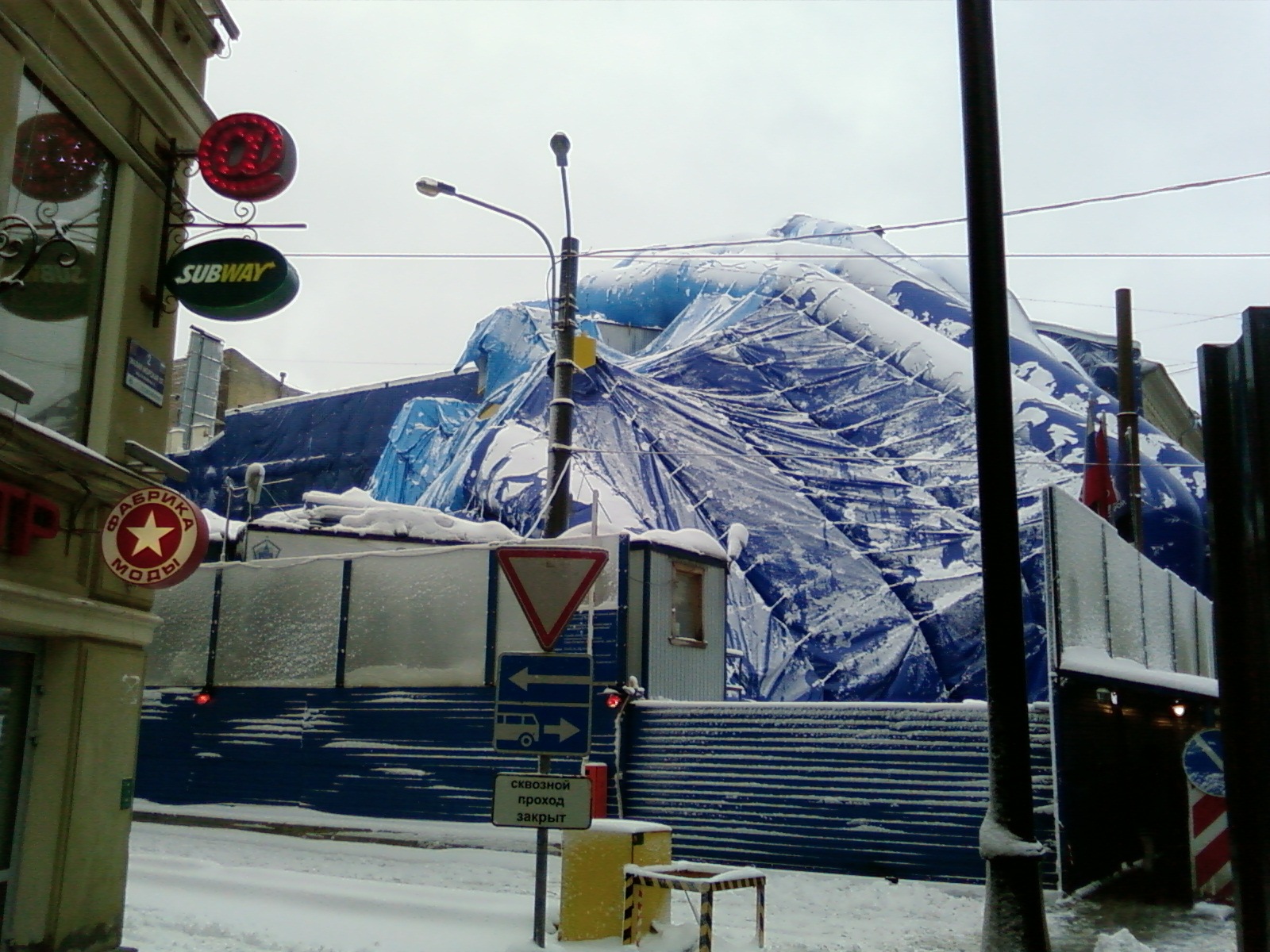 Добавим, синий шатер появился в центре города несколько месяцев назад. Водрузили его для того, чтобы шум от строящегося наклонного хода станции метро не мешал жильцам соседних домов. Уберут шатер, по некоторым данным, в конце 2011 года. Вместо него будет вестибюль станции в полностью воссозданном здании.