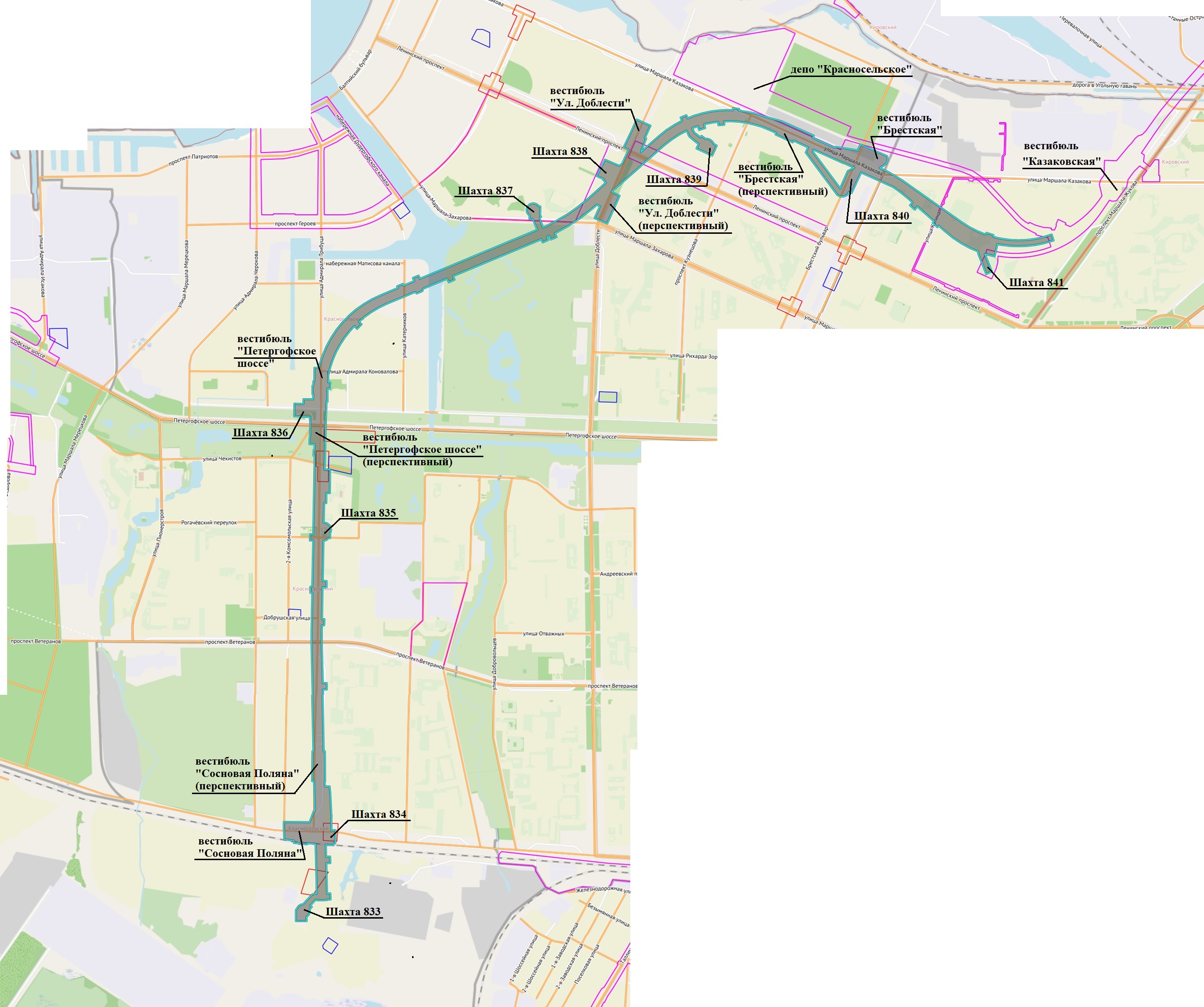 Схема проекта планировки территории с сайта РГИС участка ККЛ от ст. "Казаковская" до ст. "Сосновая Поляна" ("Казаковская" - "Брестская" - "Ул. Доблести" - "Петергофское шоссе" - "Сосновая Поляна").