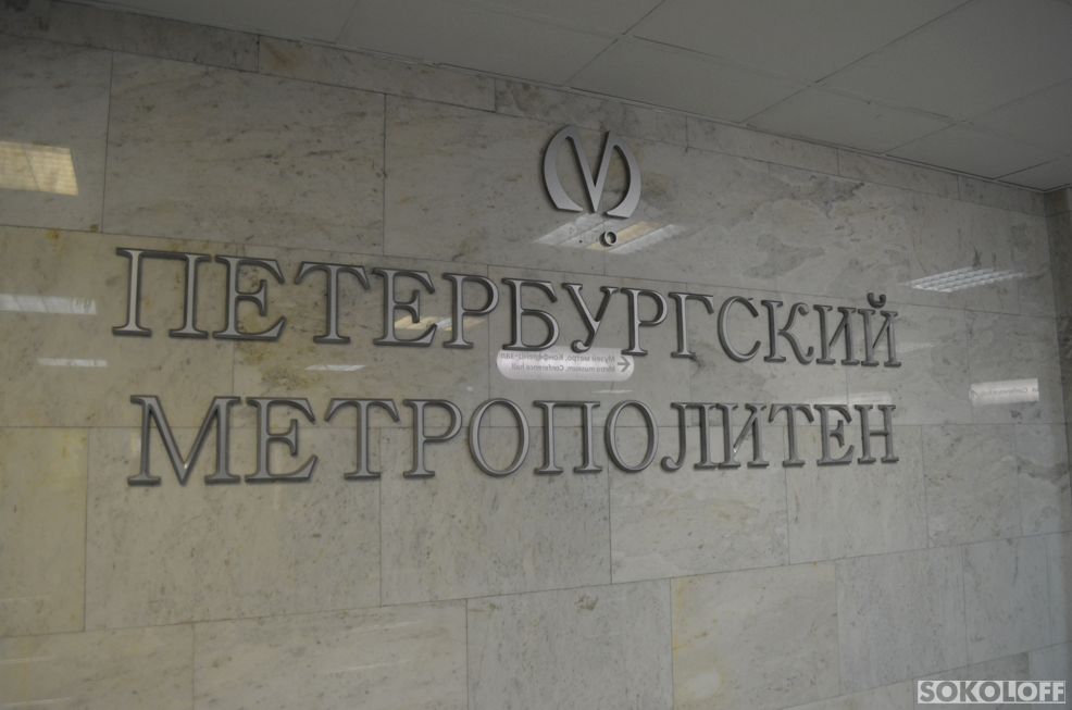 В отражении, между словами "ПЕТЕРБУРГСКИЙ" и "МЕТРОПОЛИТЕН", можно прочитать надпись на указателе: "<- Музей метро. Конференц-Зал".