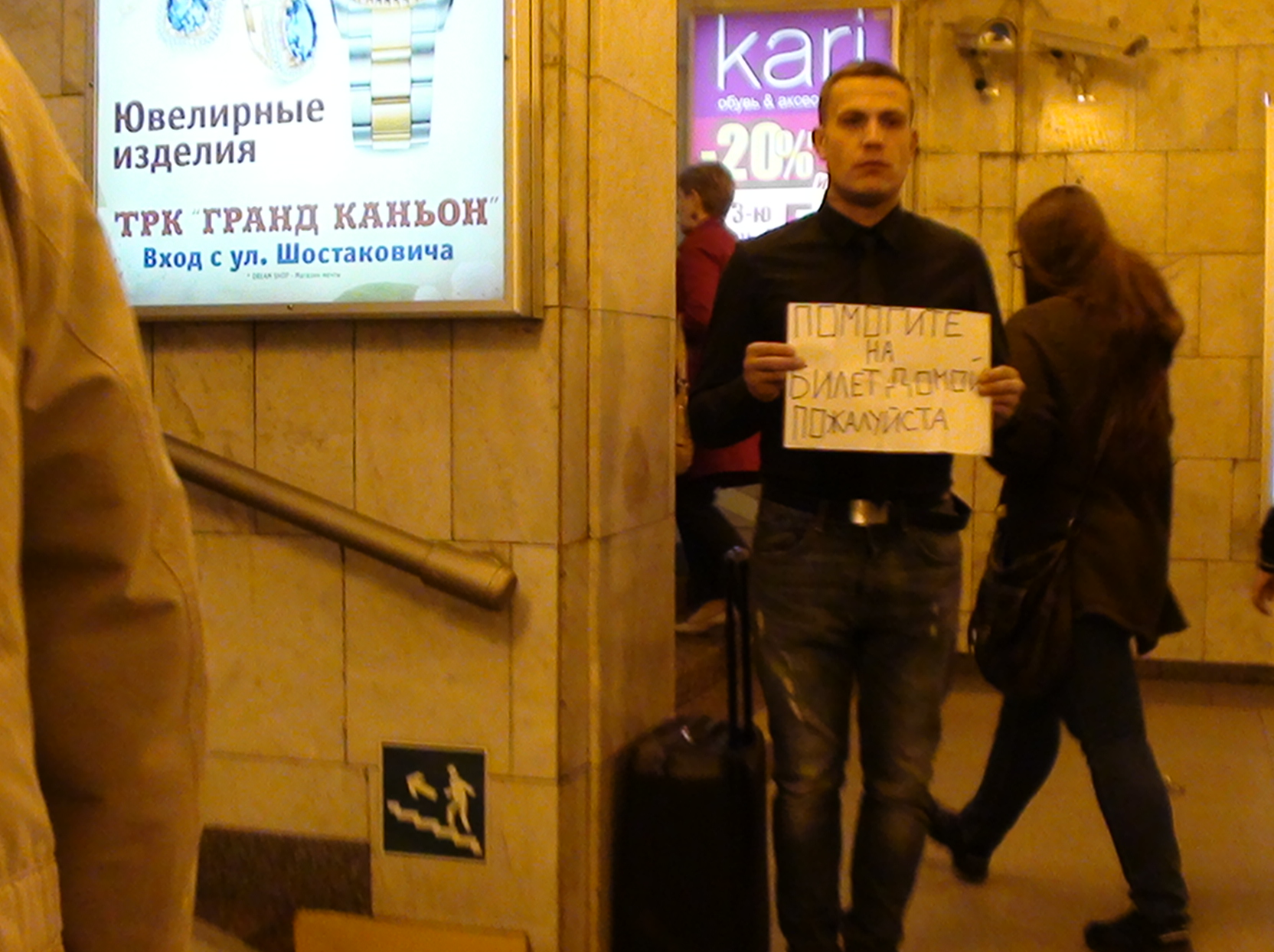Человек с табличкой "на билет домой" вчера был замечен в переходе Гостиный Двор - Невский проспект. Без чемодана. На табличке текст теперь примерно такой "Помогите на билет домой. Меня кинули".