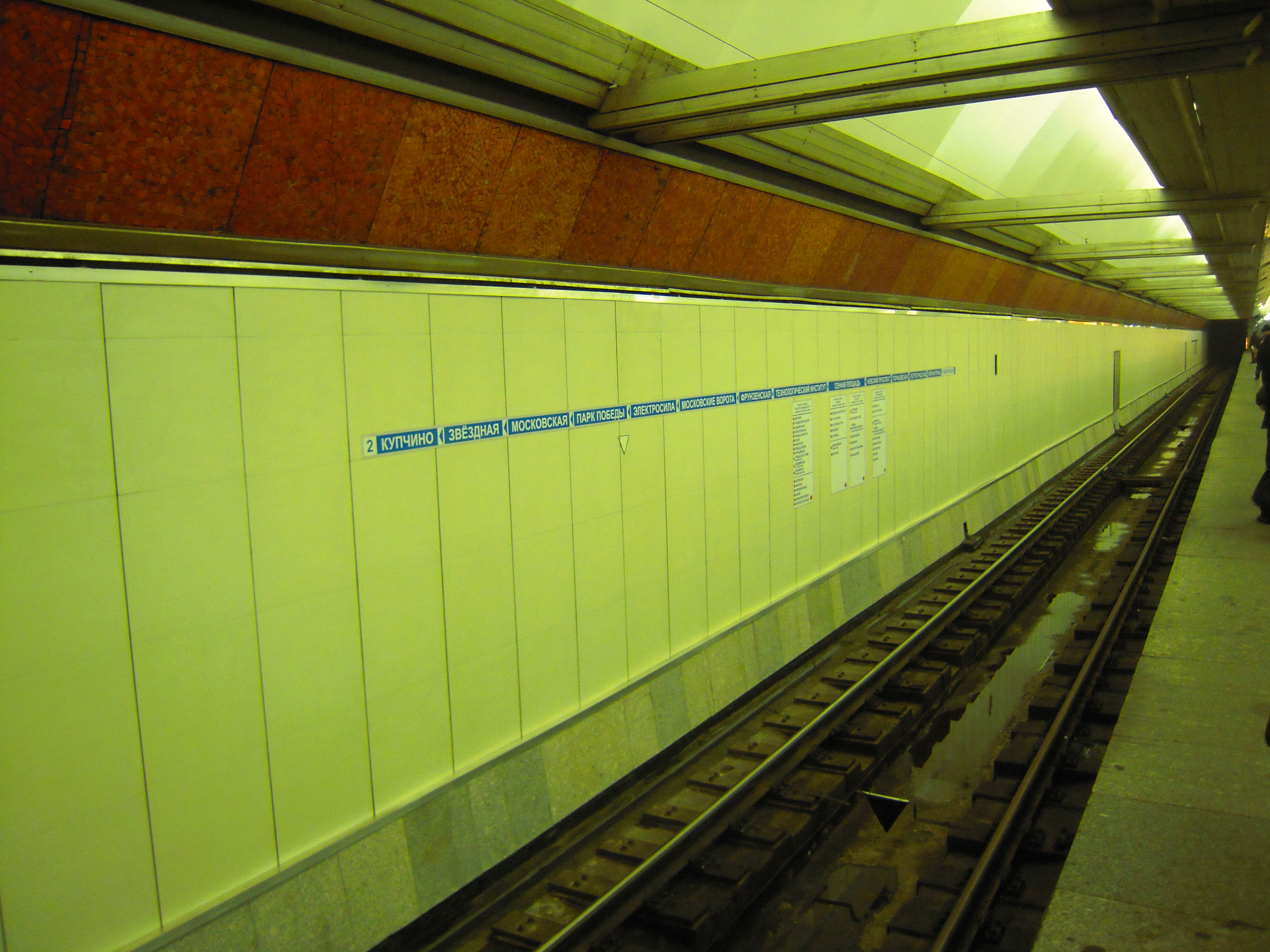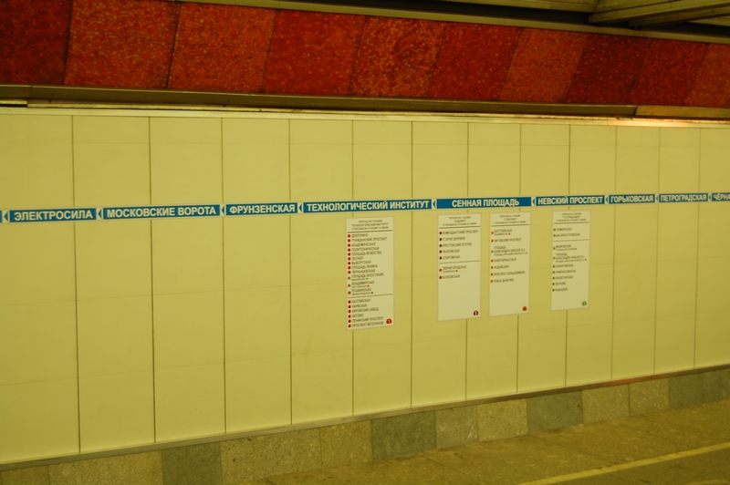 Эххх, не удалось сделать нормальные фотки станции без какого-либо оформления на путевых стенах... Сегодня утром появились указатели в сторону Черной речки, в районе остановки первого вагона. Сфоткать не успел, но очень удивило что это не совсем НИП. Такое ощущение, что они повесили старые указатели, но НИПовским способом - наклеили на стену...