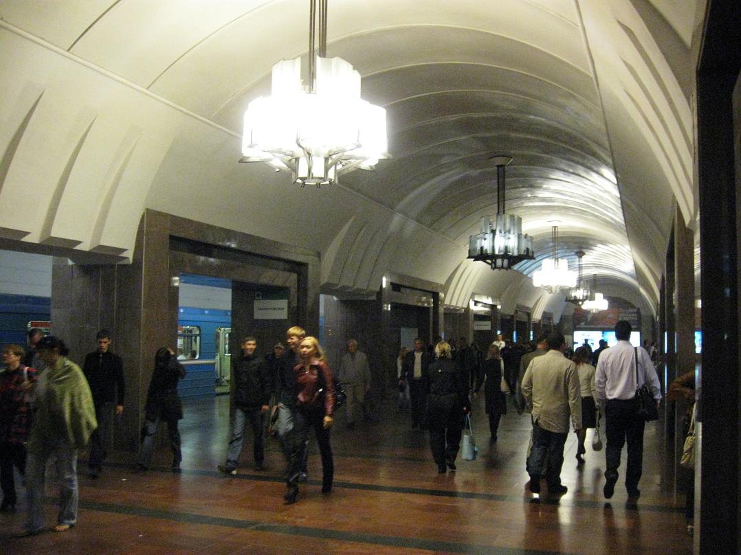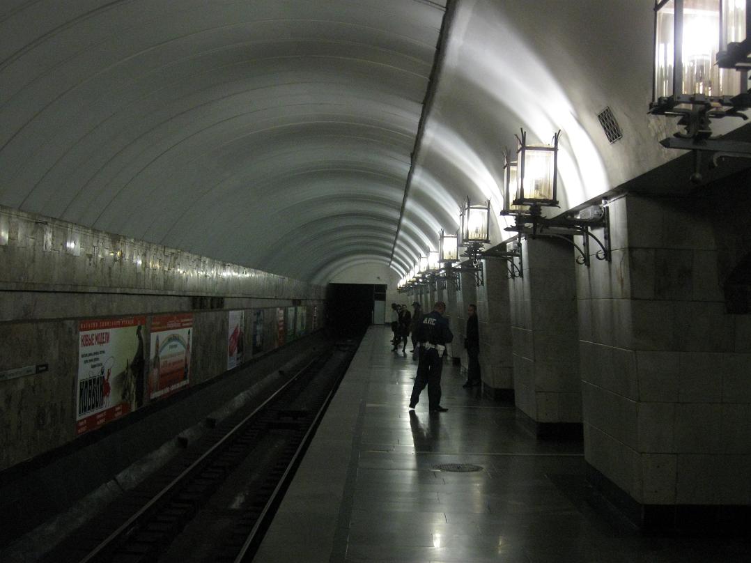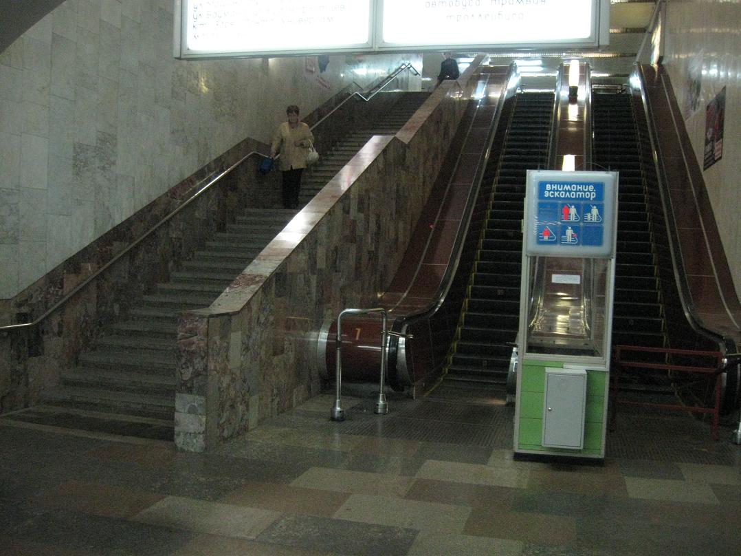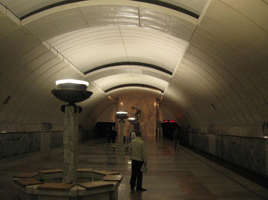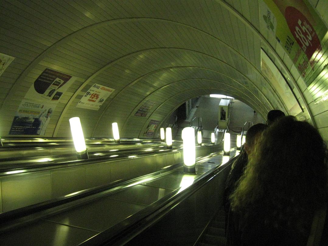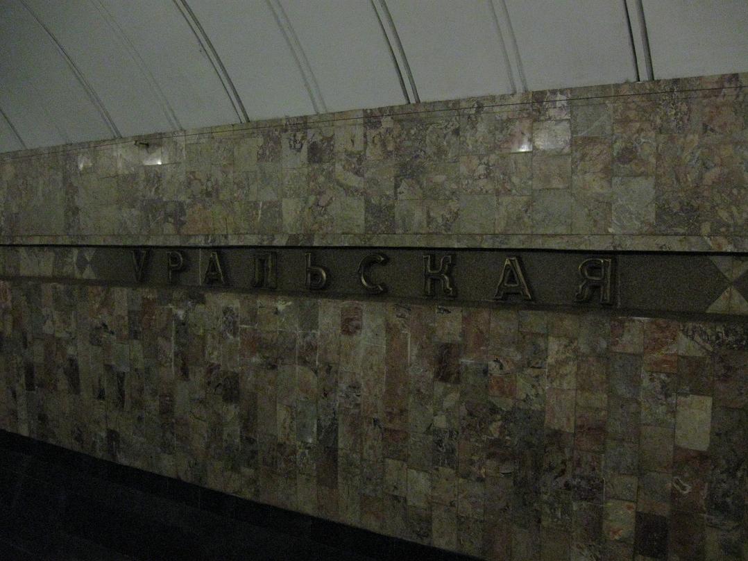 Разумеется, метро намного мельче закопано, чем у нас, на половине станций виднеются лестницы параллельно эскалаторам, кое-где, где два выхода — один оборудован эскалаторами, а другой — нет. НХ тоже залеплены рекламой чуть более чем наполовину. Вагоны, кстати, там ленинградские, те, которые видел — 81-714.5 , единственное, чтоявно было прилеплено потом — это камеры над дверями(кстати, присмотревшись, можно было заметить, что смотрят они вдоль вагона, а не на двери) и экраны, по которым также активно гоняют рекламу. Которой облеплены и стены вагона. Вообще, с этим делом там грустно- рекламы очень много,она вся разнокалиберная, смотрится ужасно. Также встречается реклама религиозной тематики, чего у нас нет. Одна радость — стёкла в вагонах оставлены чистыми. Должностых лиц на станциях практически не видно, несмотря на запрет фотографирования, мне только один раз сделали замечание, при том, что я фотоаппарат из рук не выпускал.Правда, из-за мыльности аппарата и тусклого освещения на большинстве станций(только Уралмаш смотрится где-то на уровне наших станций, остальные намного темнее) качество хромает. Собственно, по станциям, с юга на север: