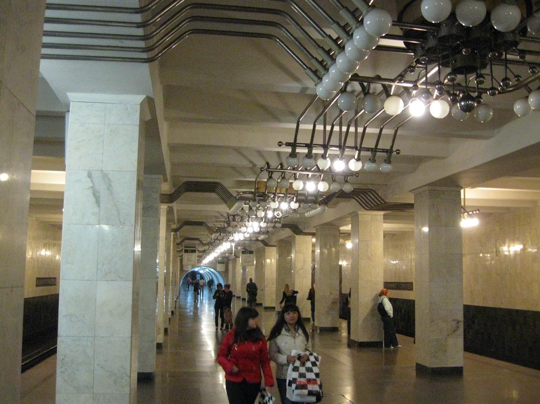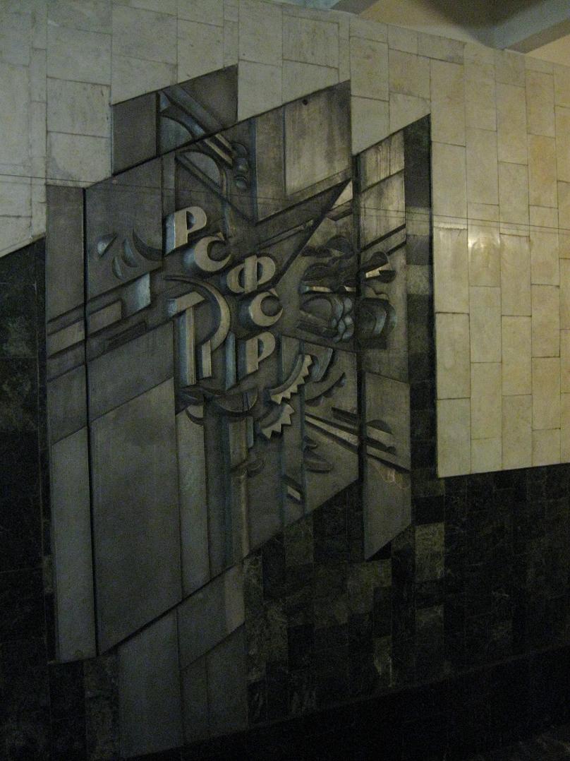 Лучше всего чувствуется, что находишься под землёй. Темно, как у негра в хижине. Чёрные стены, серый пол, металлический плоский потолок, как везде полуотключенное освещение.. Подсвеченные вставки с изображением недр на путевых стенах ещё больше подчёркивают темноту. И больше, чем где-либо бросается в глаза реклама на стенах. Этим станцию убивает напрочь — без неё она была бы мрачная, но хотя бы законченная.