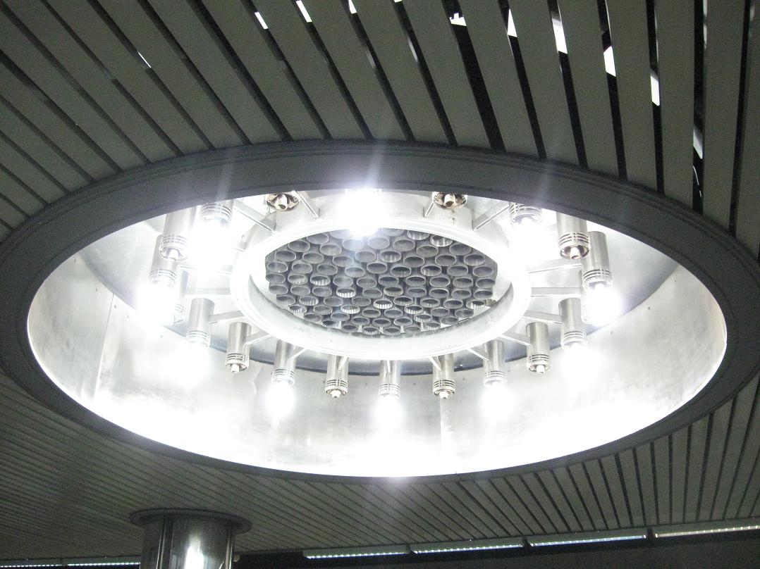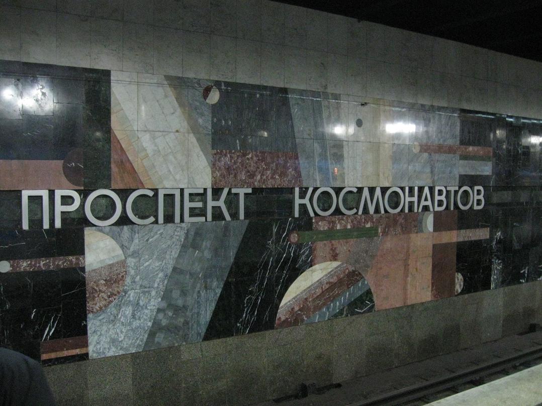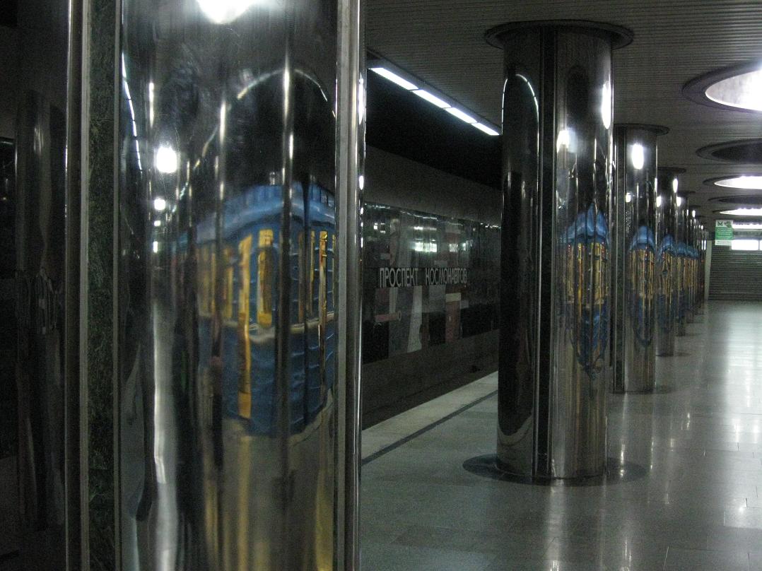 Станция тёмная, мне показалось самой тёмной после Геологической, колонны оббиты металлом, полировка поразает — отражаетсявсё и почти без искажений. Смотрится потрясающе. Светильники - с закосом под, видимо, сопла ракет. Стены — каменные, вообще пластикавоформлении станций я не увидел. Благо, Урал всё же.