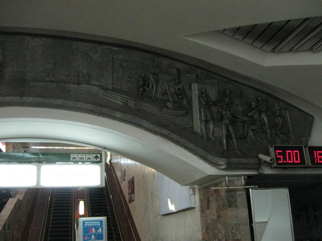 Как уже сказал, самая светлая станция, один из двух односводов привычного по Питеру вида. Порадовал свод в виде изнанки нарезного батона. Барельефы срабочими, простор — явно старались на этой станции. Здесь, кстати, как раз рядом идут лестницы и эскалаторы. Над последним грозная надпись: «Осторожно, эскалатор!».