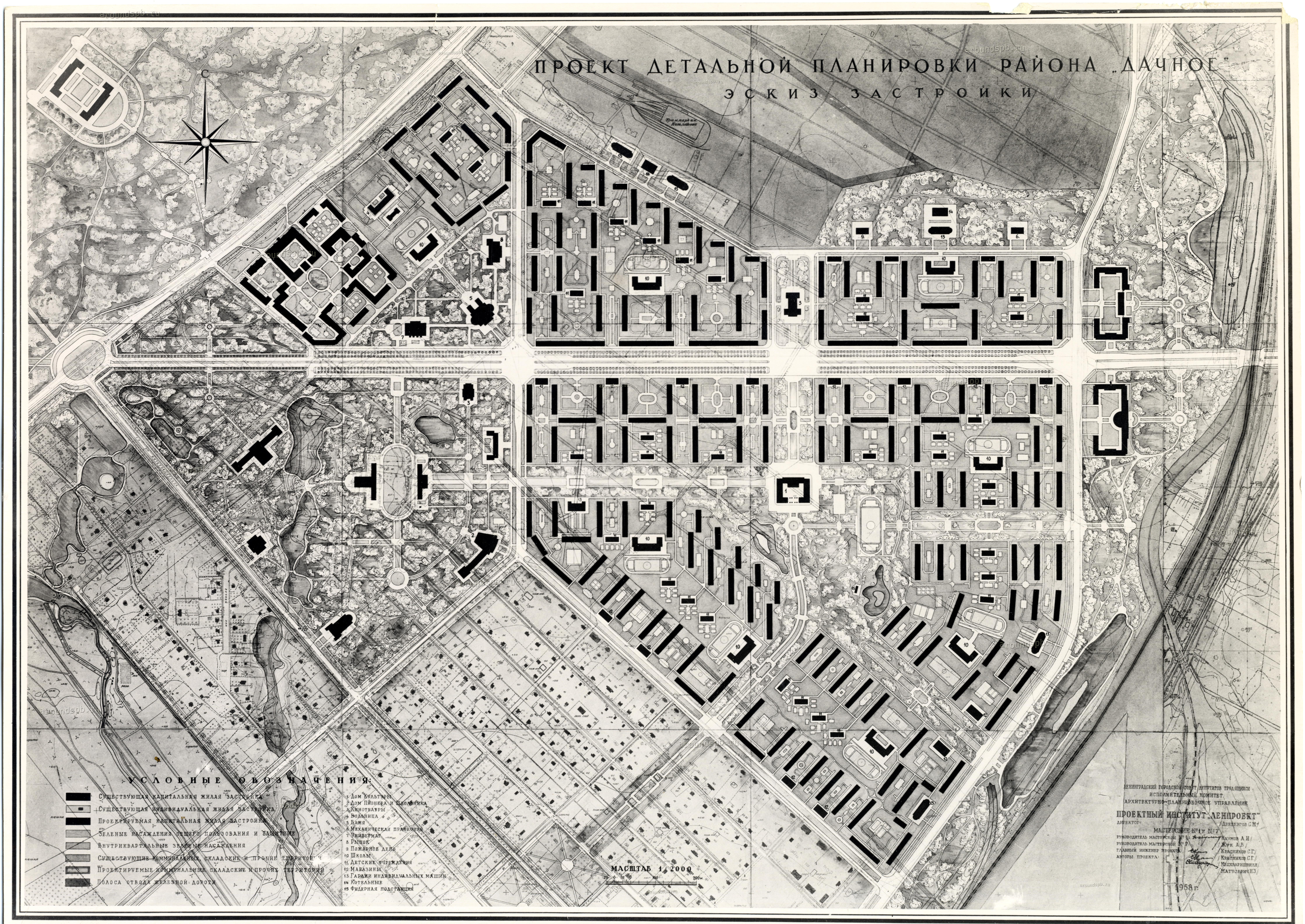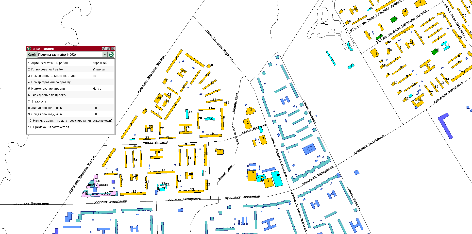 Есть такая чудесная программа — ЕИСТ-2002 (она же ТИАС-2002). В ней есть прелюбопытнейший слой под названием «Проекты планировки (1992)». В нём можно найти схемы большей части кварталов города, в том числе со всеми непостроенными в советское время зданиями (особенно много всевозможных блоков обслуживания, на месте которых в наше время стоят дома 2000-ых годов). Прилагается и информация об основных характеристиках и назначении зданий. Поиск по последнему полю выдал три интересных результата, которые я выложу в соответствующие темы. Первый — в районе участка на пересечении проспекта Ветеранов и улицы Солдата Корзуна, о котором упоминалось парой постов выше
