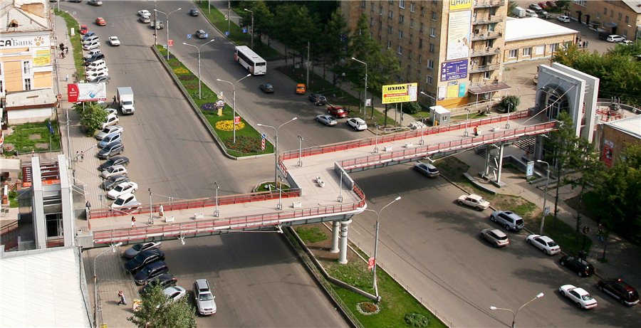 А что вы скажите о не слишком широких улицах/проспектах и не широких тротуаров вдоль них? На приведенных снимках выглядит это вполне сносно (поскольку тротуары позволяют), и что самое главное угол наклона спуска, не очень сильный. Но в ограниченном пространстве этот угол увеличиться (я в курсе, что есть соответствующие ГОСТы и СНиПы), и подняться/спуститься, особенно в зимний период захотят (в т.ч. в силу здоровья) не все. Ладно, подъем/спуск с перехода можно сделать дальше от самого пролета, чтоб угол наклона был меньше. Но, во-первых, тогда надо передвигать и сам переход, поскольку лестничный марш должен быть максимально близко к остановке или наземному пешеходному переходу, во-вторых, весь путь по такому надземному переходу увеличится и большему количеству пешеходов будет, проще, перейди по проезжей части (с тем учетом, что мы рассматриваем не широкие улицы/проспекты). Делать подъем/спуск в «несколько» этажей, также, плохо по тем же причинам. Характерный пример, пр. Науки. С возведением на нем известного гипермаркета, переход у дома 10 (в нем другой небезызвестный, ужасный, недомагазин), стал занятным аттракционом. Когда появился гипермаркет, огромный жилой массив (с четной стороны) «пошел» туда, превратив пешеходный переход в не останавливающуюся беговую дорожку с препятствиями, «машинам там не место». В этот гипермаркет ходит очень много людей старшего поколения (поверти мне, их тоже не устраивает тот самый недомагазин и пр. мелкие магазинчики с небольшим ассортиментом), так вот эти люди на 90% не пойдут на этот надземный переход. Для них он будет или очень «высок» или очень «далек» и проще будет перейти прямо через проезжую часть. Если кто-то сомневается, что в этом месте нужен подземный переход…. милости просим, welcome. Конечно, и в подземный переход надо спускаться/подниматься, но, может это и субъективно, угол наклона там не такой большой. Плюс ступеньки там не металлические (хотя, наверное, и у надземных переходов тоже разные ступеньки есть). Уж не пишу про эстетическую сторону. В новых районах или где-то в центральной части или на значимых городских проспектах, может, и сделают красиво. А вот в давно сложившихся спальных массивах, скорее всего, будет урбанистическая конструкция, не радующая глаз. В общем, понятно, как у нас с городским облагораживанием, посадили красные тюльпаны, и скажи спасибо. Понимаю, во многом этот вопрос упирается в деньги. Возможно, со мной многие не согласятся, но кмк, лучше 2-3 подземных переходов, чем 10 надземных. Напоминаю, речь идет о нешироких тротуарах