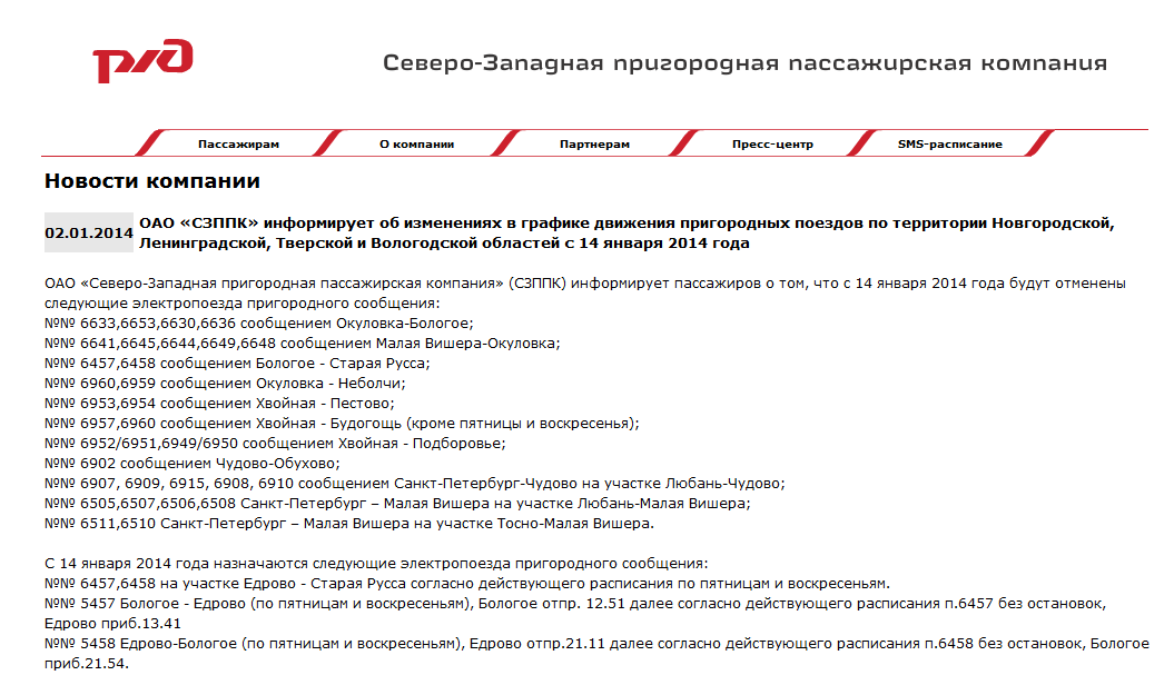 ОАО «Северо-Западная пригородная пассажирская компания» (СЗППК) информирует пассажиров о том, что с 14 января 2014 года будут отменены следующие электропоезда пригородного сообщения: