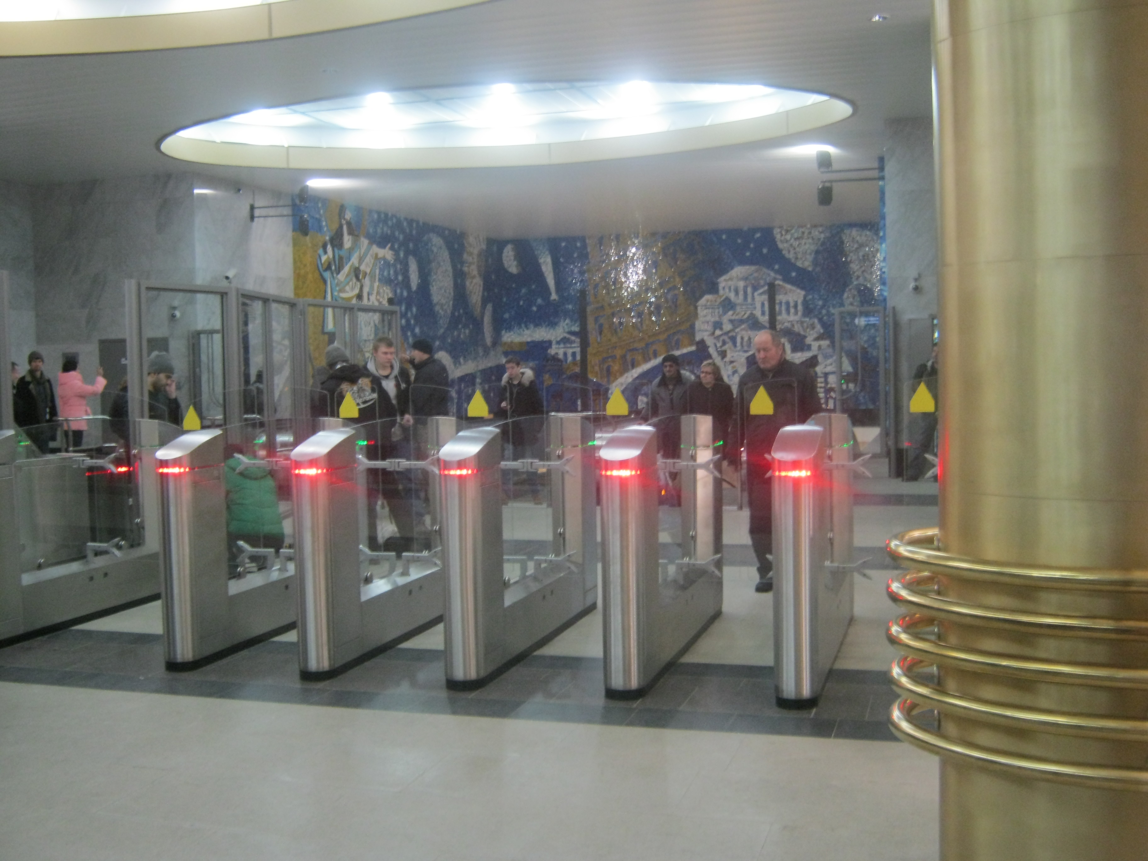 Здание, в которое встроен вестибюль, не понравилось крайне - какое-то нагромождение фигур и поверхностей. Вестибюль показался потеснее, чем у Бухарестской. Дистанцируясь от мозаик (на мой взгляд, на Бухарестской они более удачны), отмечу интересное решение дверей на путевых стенах и различных решеток - классно смотрятся. Оформление сводов в виде меридианов не очень как-то впечатлило. Понравились скамейки и освещение колонн сверху. Сами колонны очень неудачными мне показались, какие-то тяжеловесные и слишком широкие, да и по цвету как-то со всем остальным не сочетаются. А так, суммируя, станция скорее понравилась, чем нет.