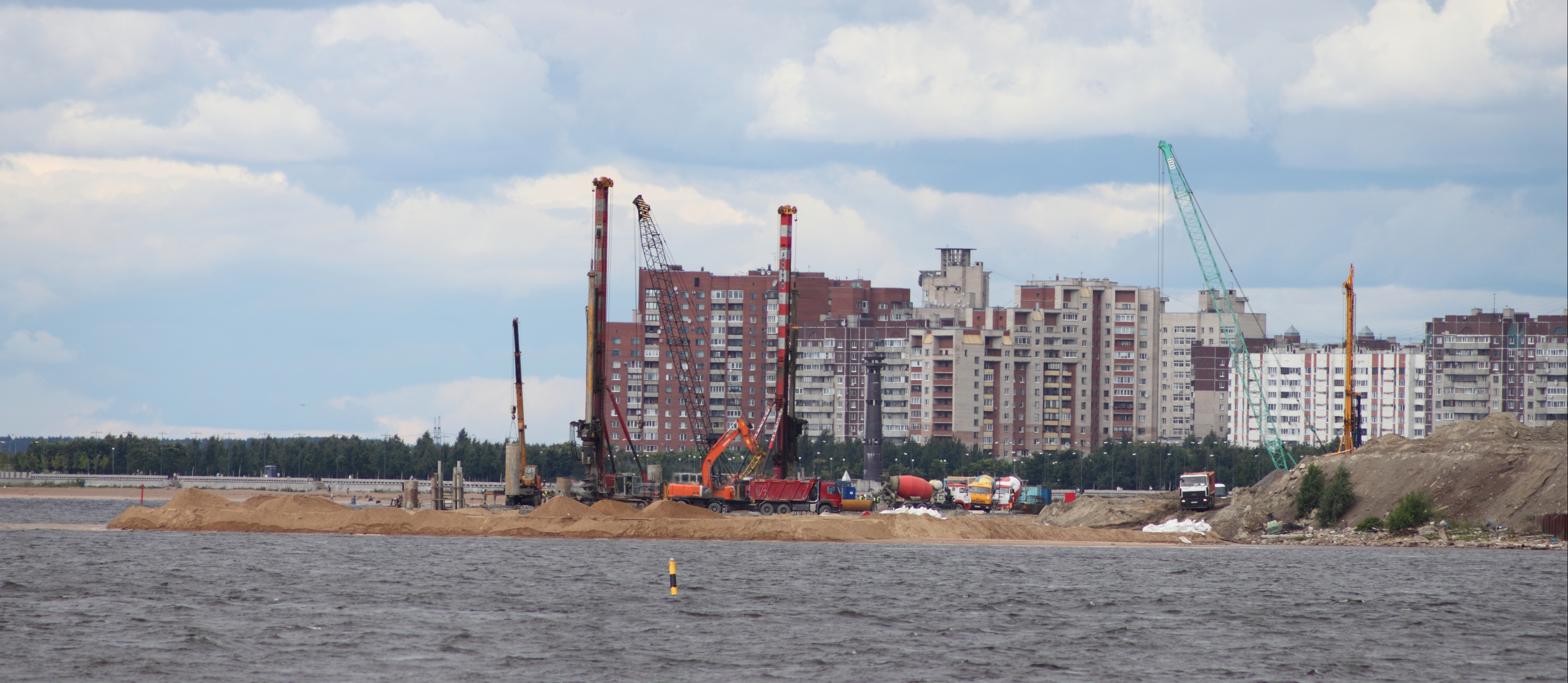 Во-первых, если строить с восточной стороны стадиона, то никакого намыва не нужно, следовательно не будет и "таких же" стройплощадок.