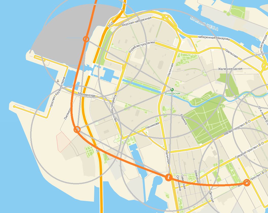 И обязательно добавил бы вторую станцию, на будущем намыве острова Декабристов, на оси Капитанской улицы.