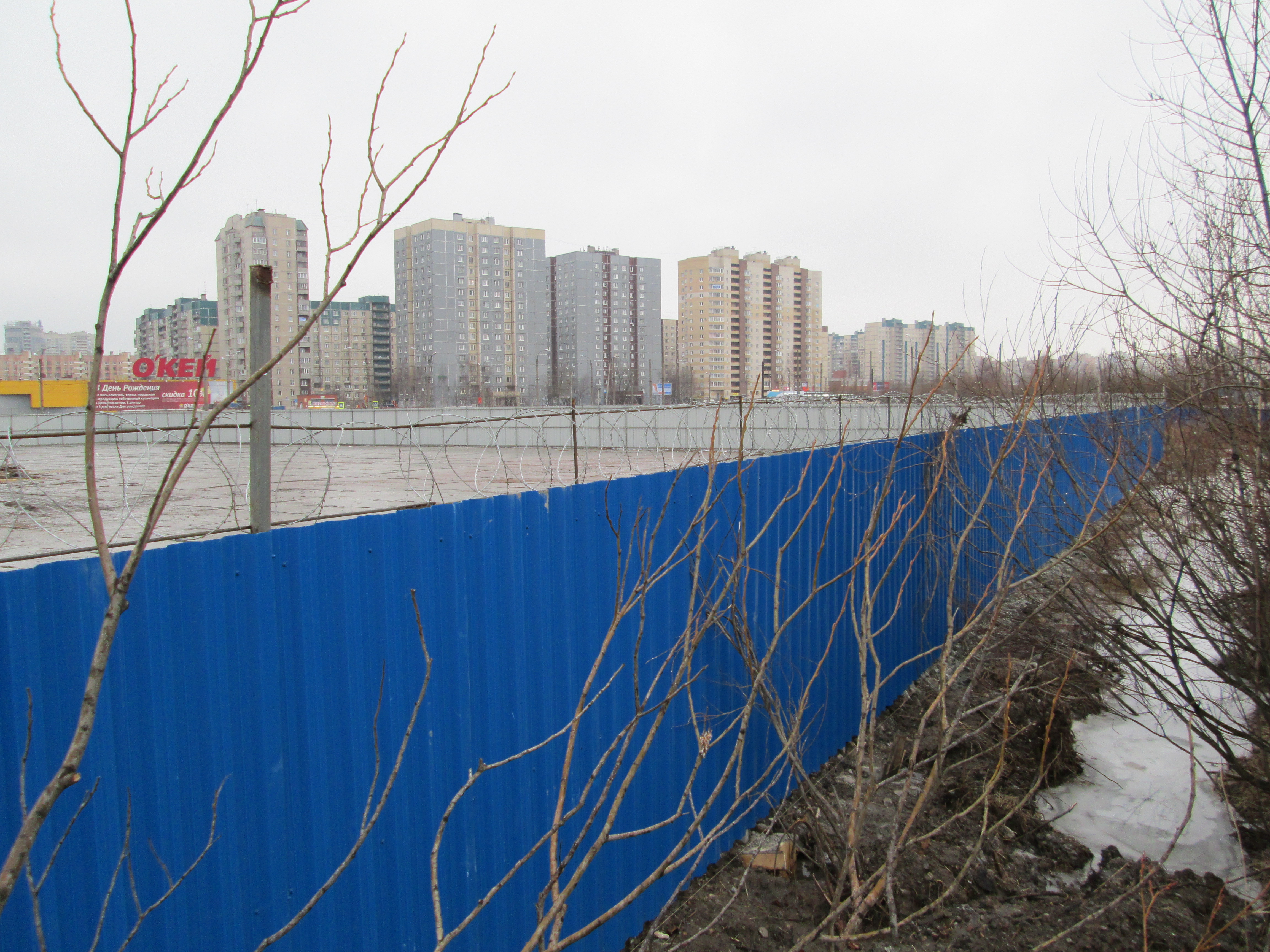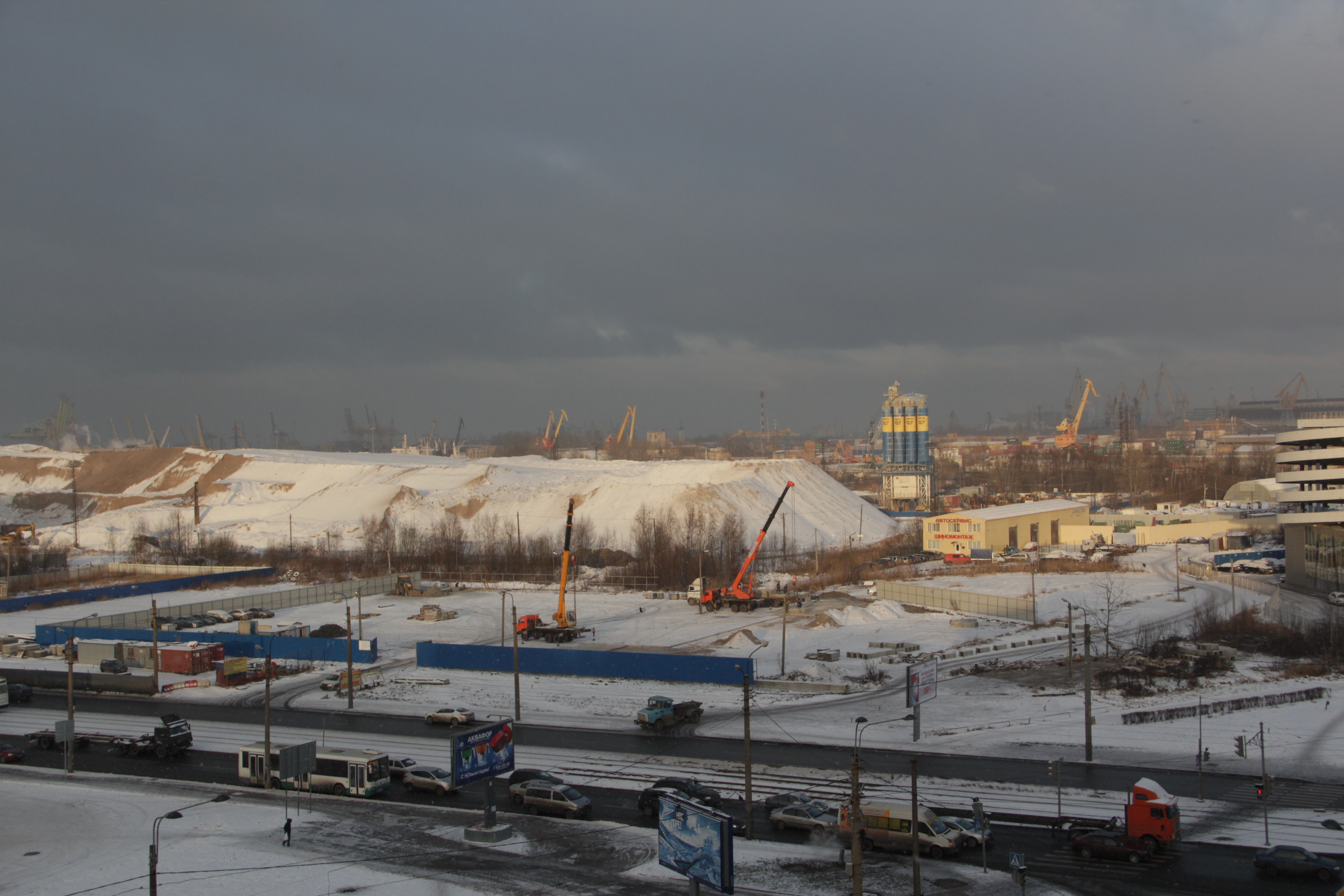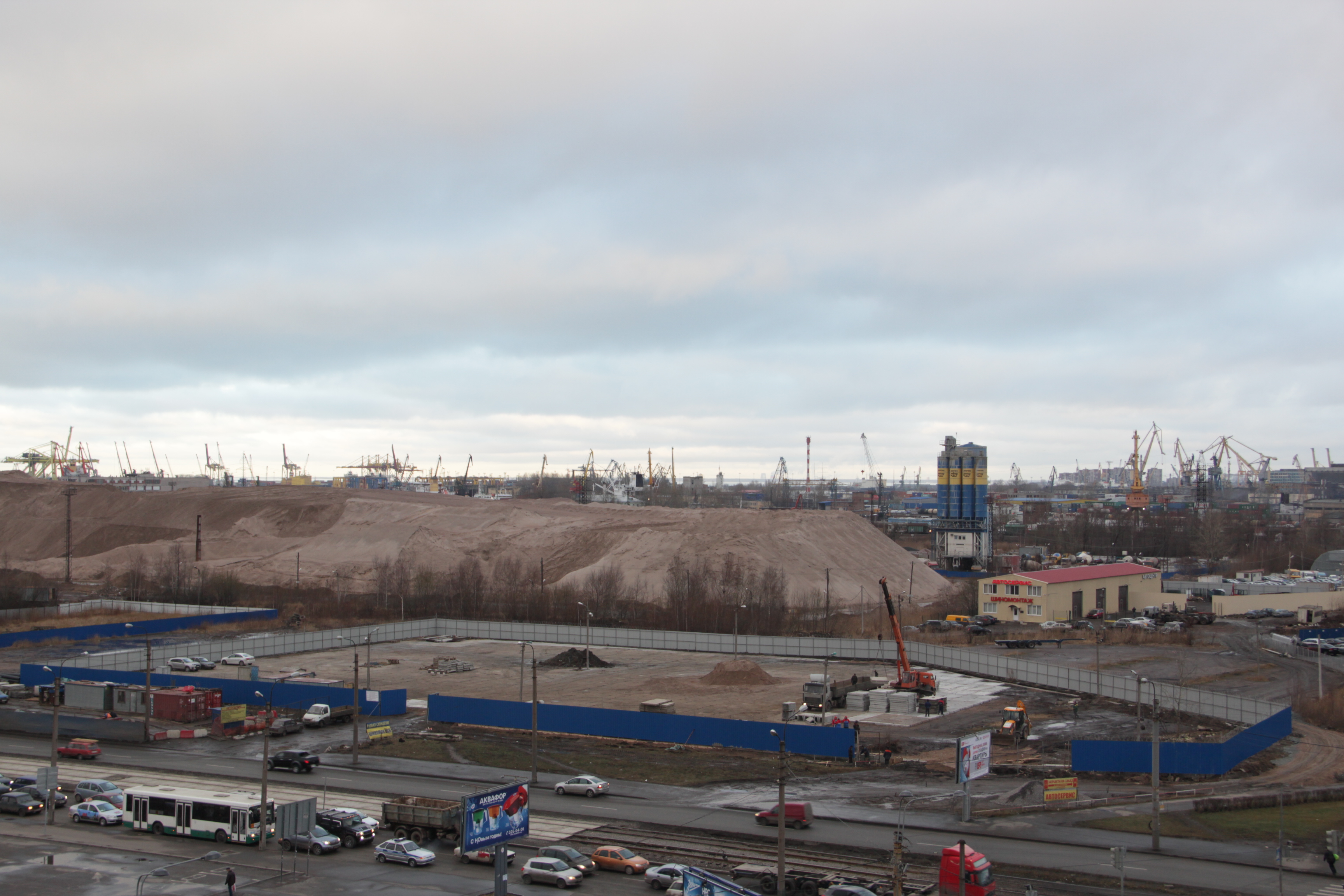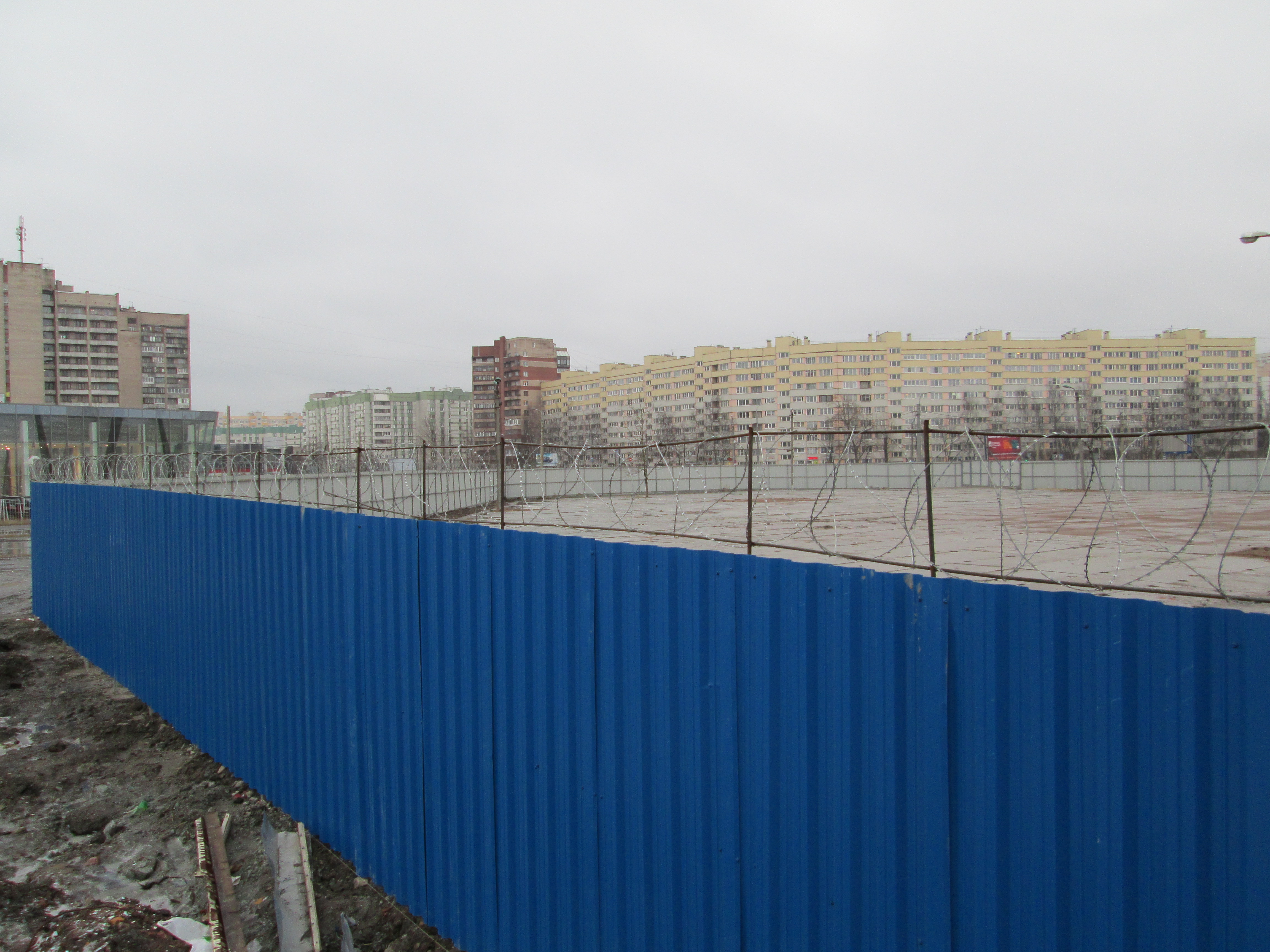 Очередные фотографии с объекта - периметр стройплощадки почти полностью замкнут, продолжается и близится к завершению укладка плит. Восточнее забора сооружена временная объездная(вместо находившейся ранее на территории площадки) дорога для подъезда к автосервису и другим организациям, расположенным позади территории площадки