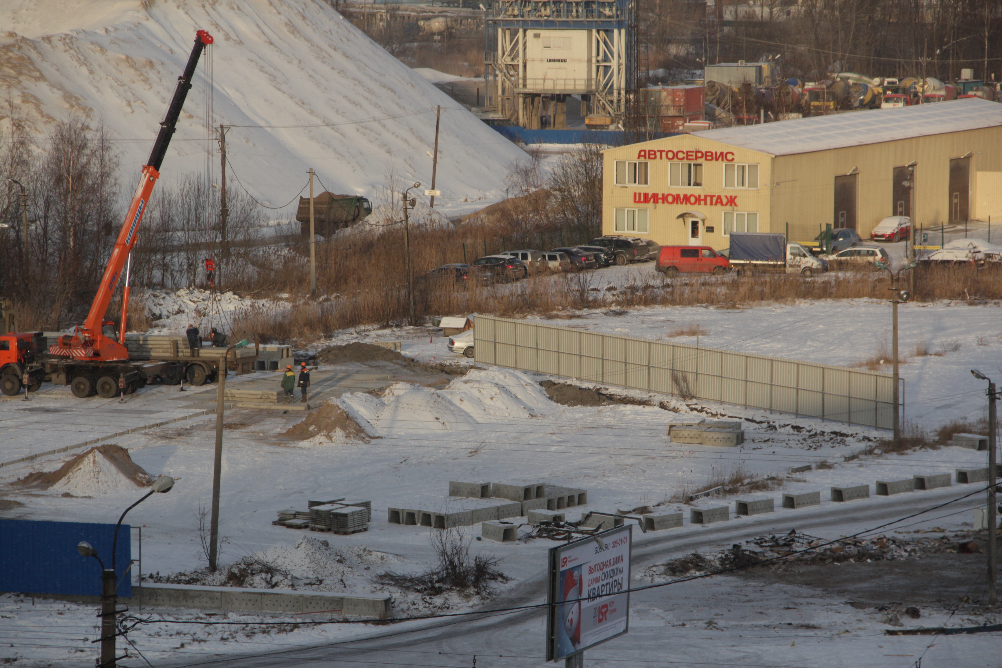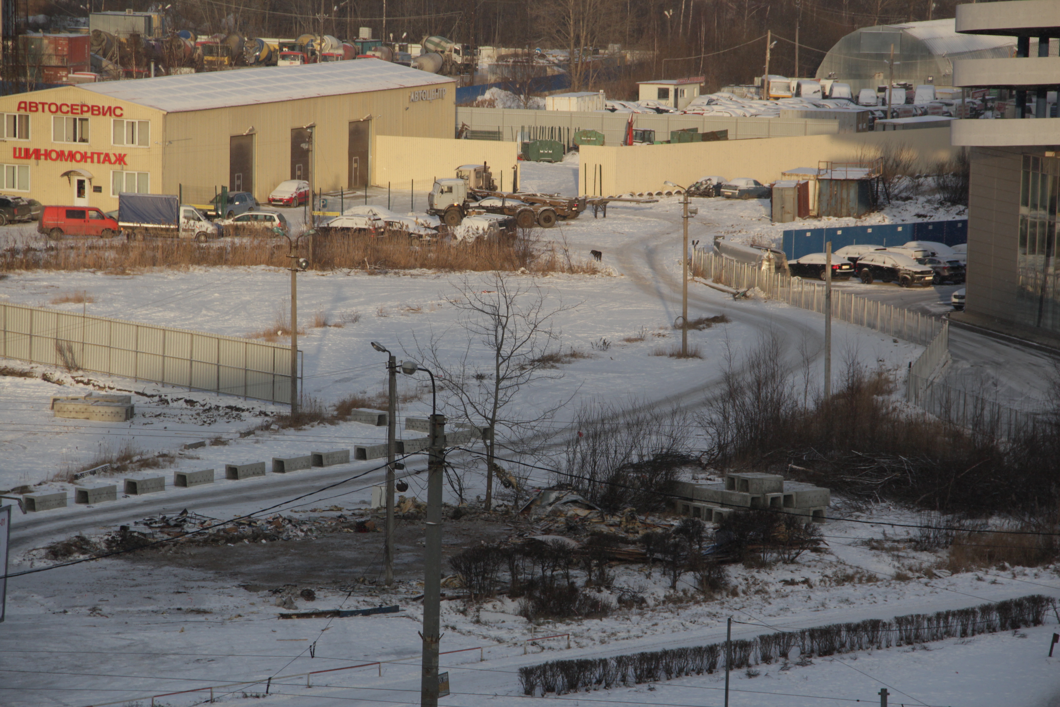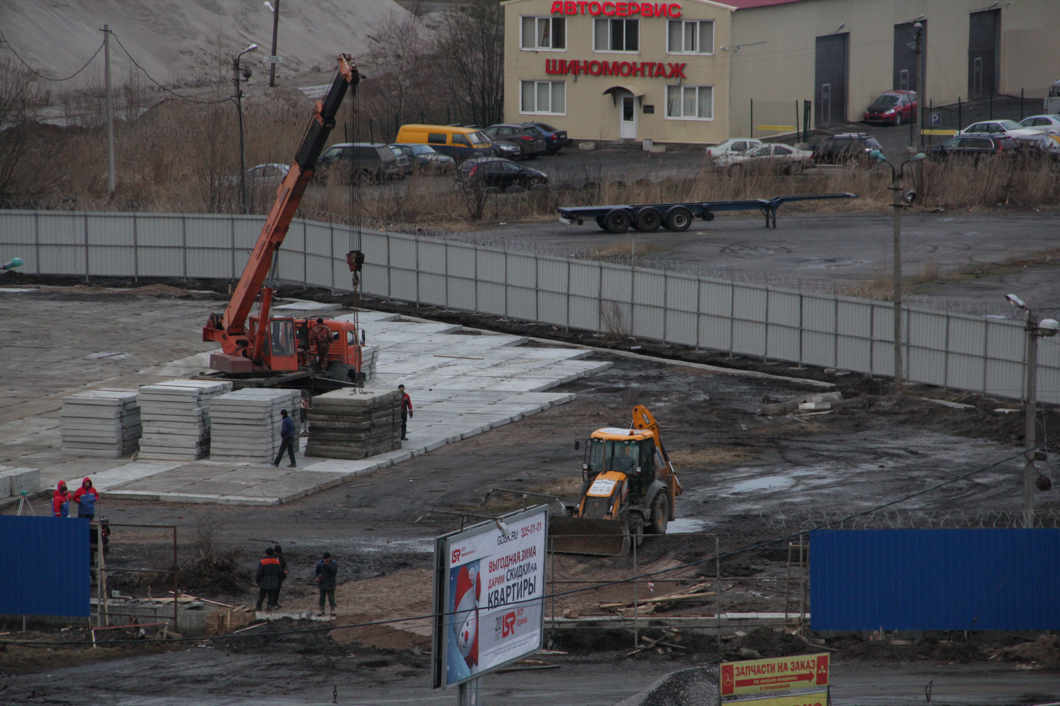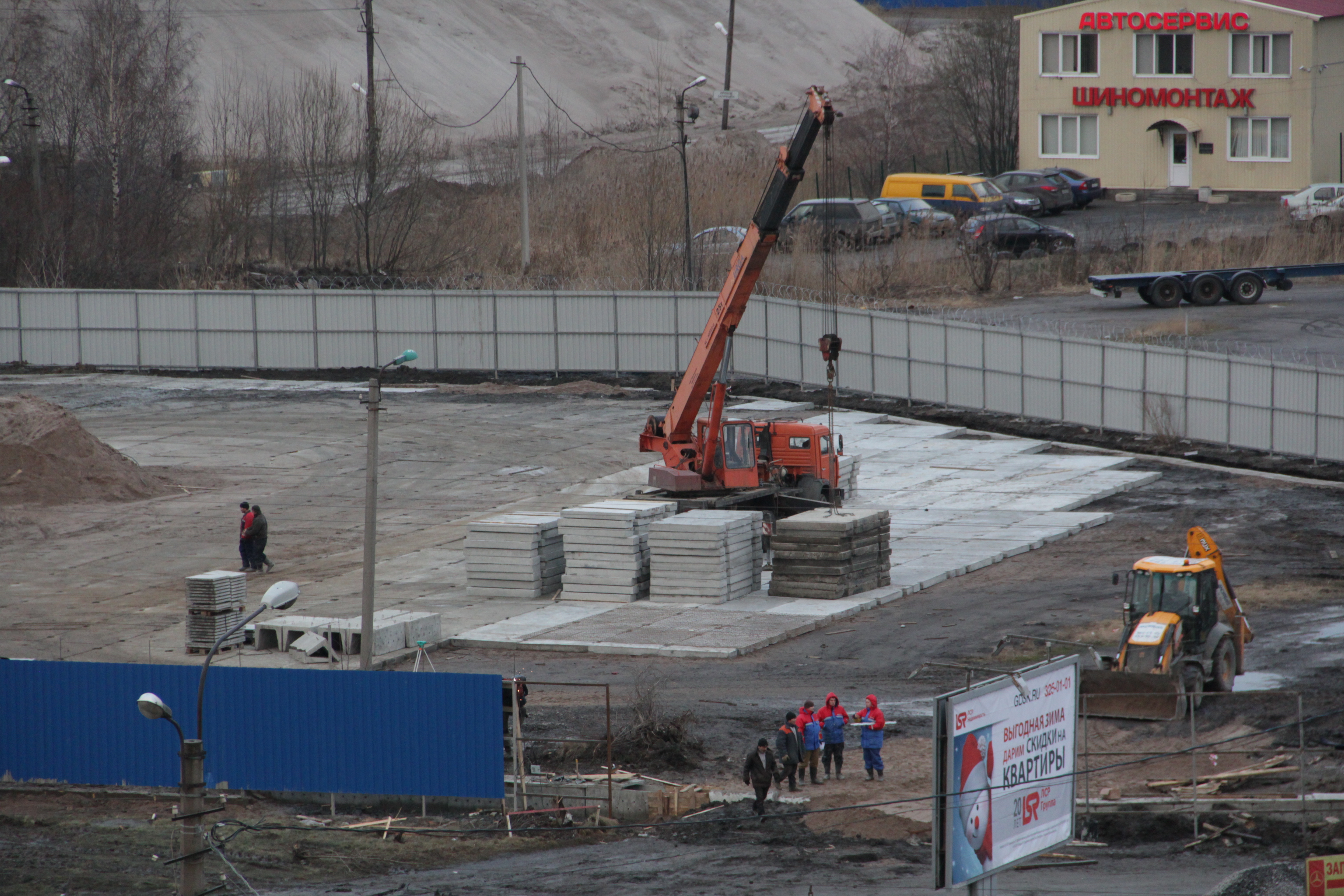 Свежие фотографии по состоянию на 9 декабря. Здание автосервиса полностью снесено. На участке установлены опоры для освещения площадки, продолжается укладка плит...