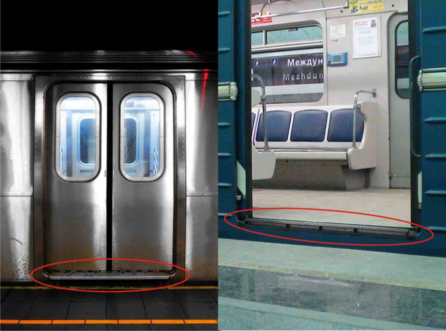 Ещё одна из странностей в вагонах - пороги. Непонятно, зачем их было делать выпуклыми...В Москве, их кстати на старых вагонах вплодь до Еж3/Ем-508Т и некоторых безымянных частично вырезают, что и подтверждает их ненужность.