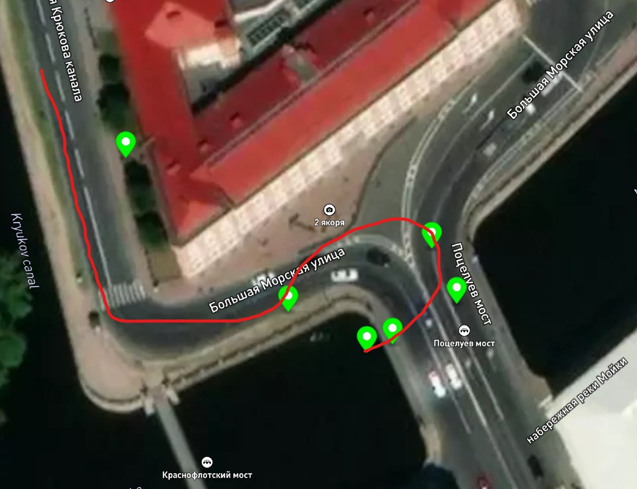 Очевидно, что автобус входит в Мойку под прямым углом. Соответственно, рулевое не заклинило. Иначе бы траектория была иной.