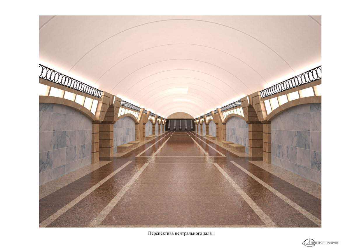 Конструктивное решение станции будет необычным для петербургского метрополитена: в центре зала поставят мощные колонны, по своему внешнему виду напоминающие кили кораблей. Своды будут подчеркнуты рельефными балками, которые будут начинаться у основания колонн, а заканчиваться – на стене путевого тоннеля. Все это придаст станции динамику и энергичность.