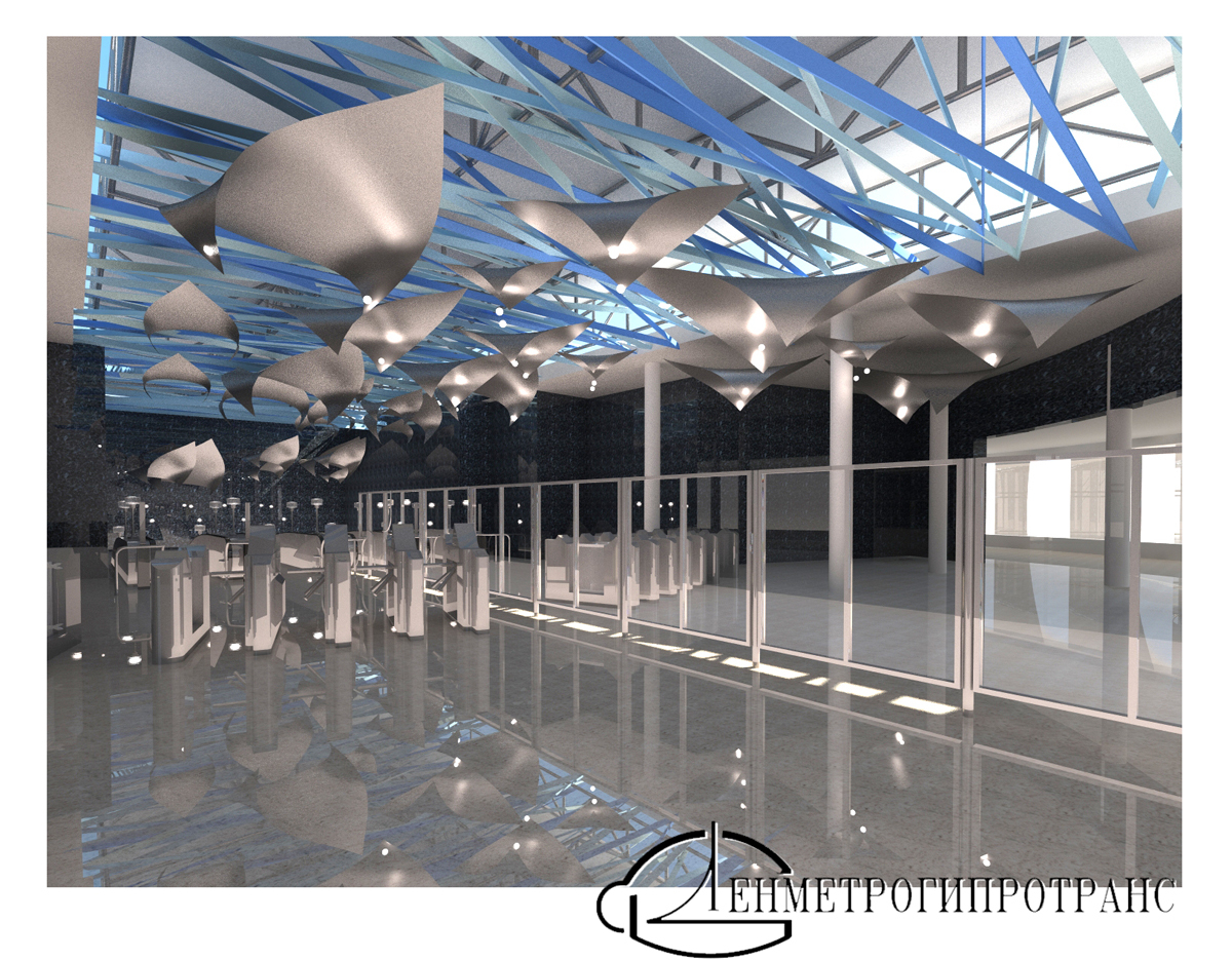 Еще более смелое решение предусмотрено для наземного вестибюля: здесь потолок украсят решеткой в конструктивистском стиле. Снизу на ней будут изогнутые металлические листы, напоминающие то ли паруса, то ли просто морскую волну. К краям этих листов, в свою очередь, прикрепят светильники. Свет от них будет отражаться в вогнутой части металла и одновременно – в полу с зеркальным покрытием.