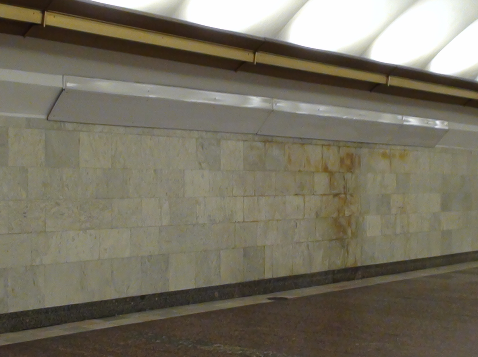 Давненько не выходил на Лиговском проспекте. Потому и не видел столь длинный коридор. Оказывается, течь заделали. Но необычным способом. Наложили специальные пластины...Насколько я помню, это место всегда текло.
