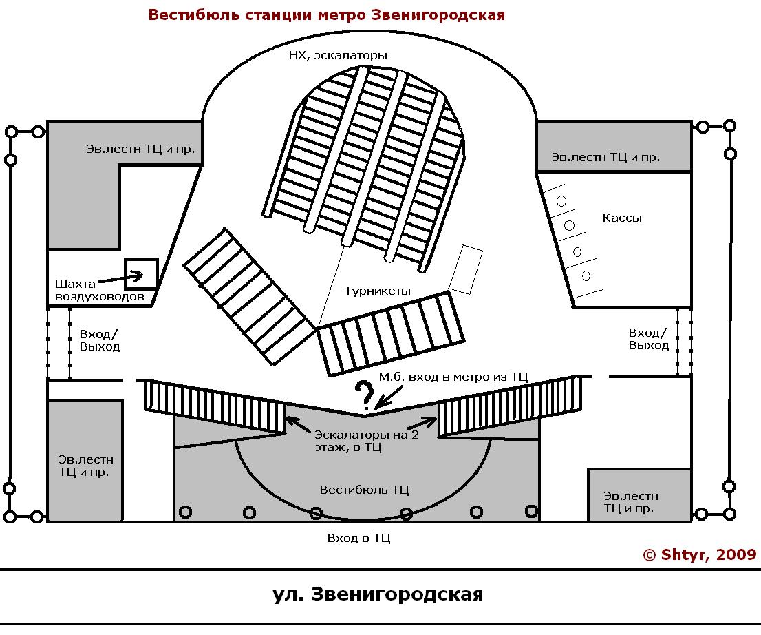 Серым цветом я пометил территорию, не относящуюся к метрополитену (например, эвакуационные лестницы из ТЦ и всякие подвозы для загрузки товаров). Что такое "шахта воздуховодов Ленметрогипротранс" я не понял, но отметил - она выходит на крышу. В центральном входе в ТЦ есть некоторая непонятная вещь, судя по всему какая то заготовка под прямой вход в метро, т.к. там отмечены ограждения (чтобы закрывать на ночь видимо). Остальное думаю понятно из рисунка и комментарии на нем, всякие служебные помещения и сан.узлы рисовать я не стал