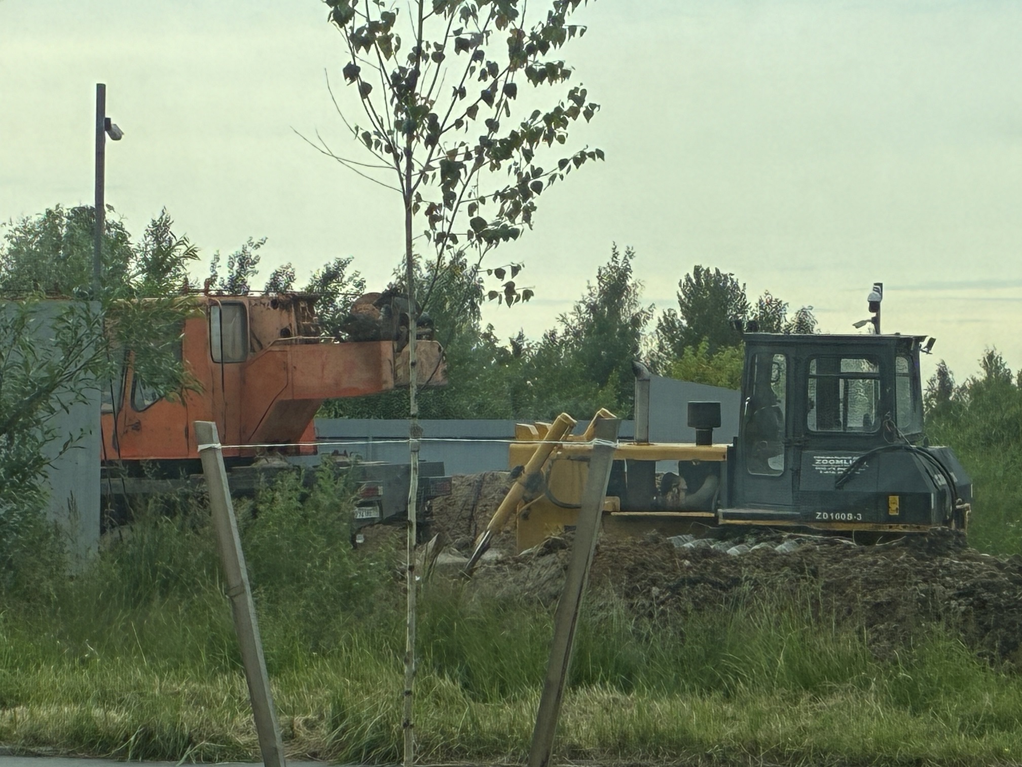 Разобрали часть забора, привезли гусеничный бульдозер, автокран и дорожные плиты.