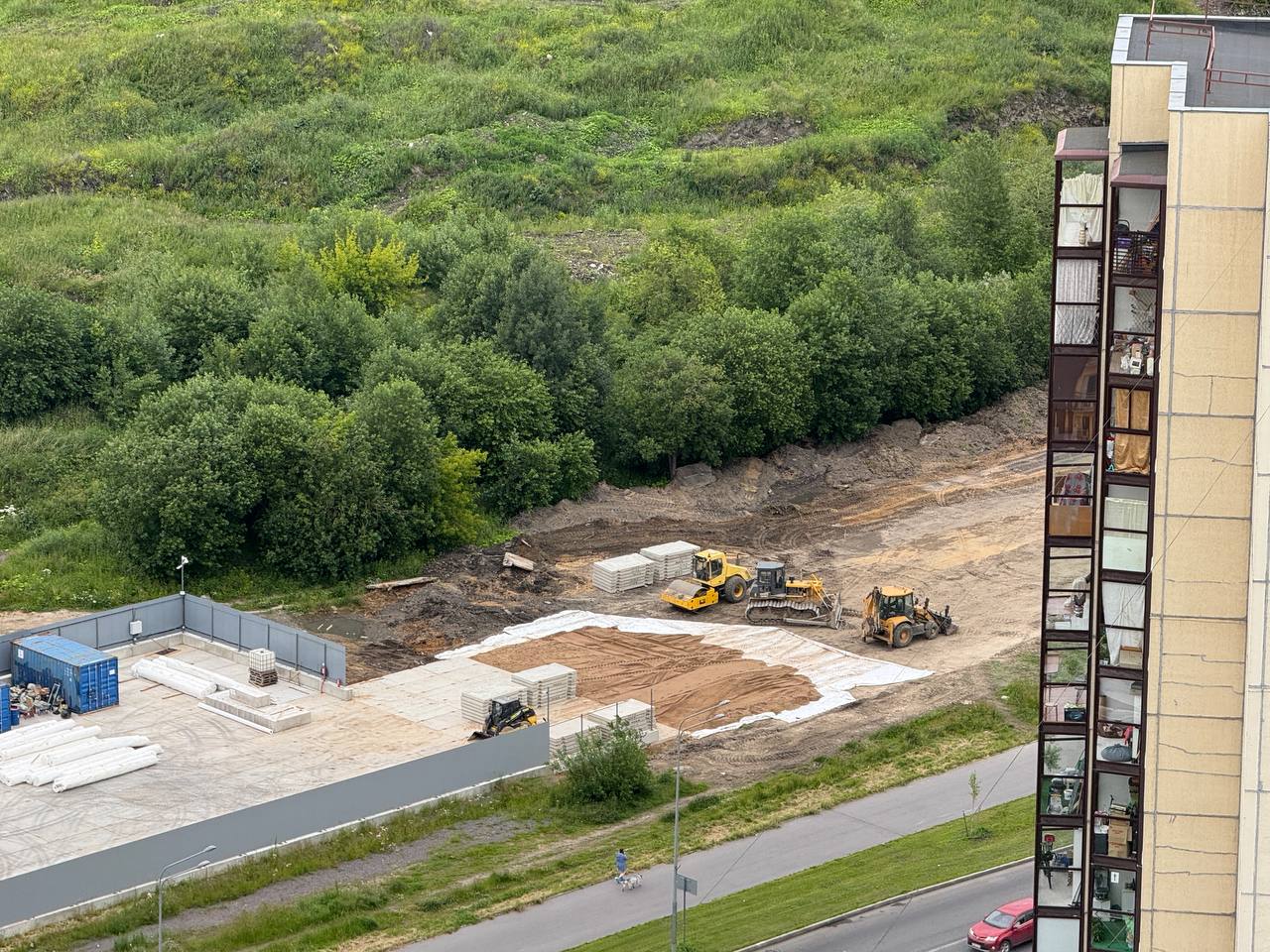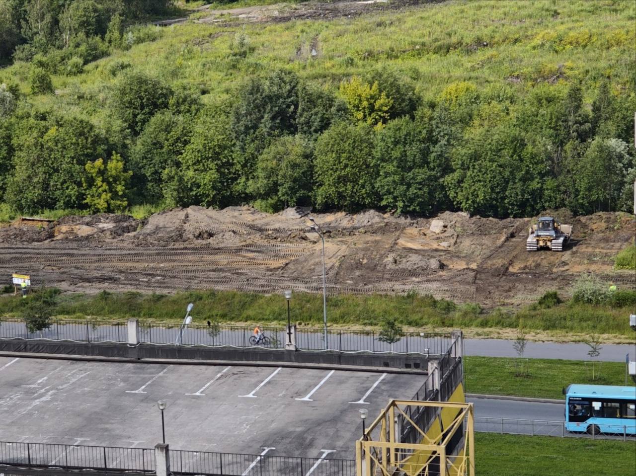 Пока расчистили площадку размером примерно с существующую, вчера из техники еще появился грунтовый каток.