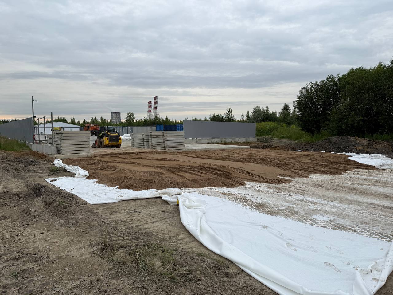 Здесь продолжили обустройство строительной площадки: выравнивание территории и укладку бетонных плит.