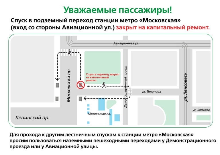 С 26 ноября 2018 года, в связи с капитальным ремонтом, закрыт лестничный спуск в подземный переход северного вестибюля станции метро "Московская" (выход в сторону Авиационной улицы). Непосредственно у этого выхода находятся две остановки наземного общественного транспорта, с которых происходит постоянная пересадка на метрополитен. Сейчас, чтобы попасть в метрополитен пассажирам приходится делать крюк длиной до 311 метров.