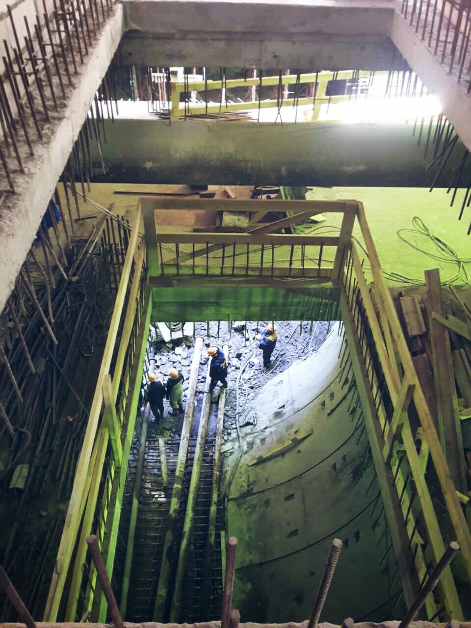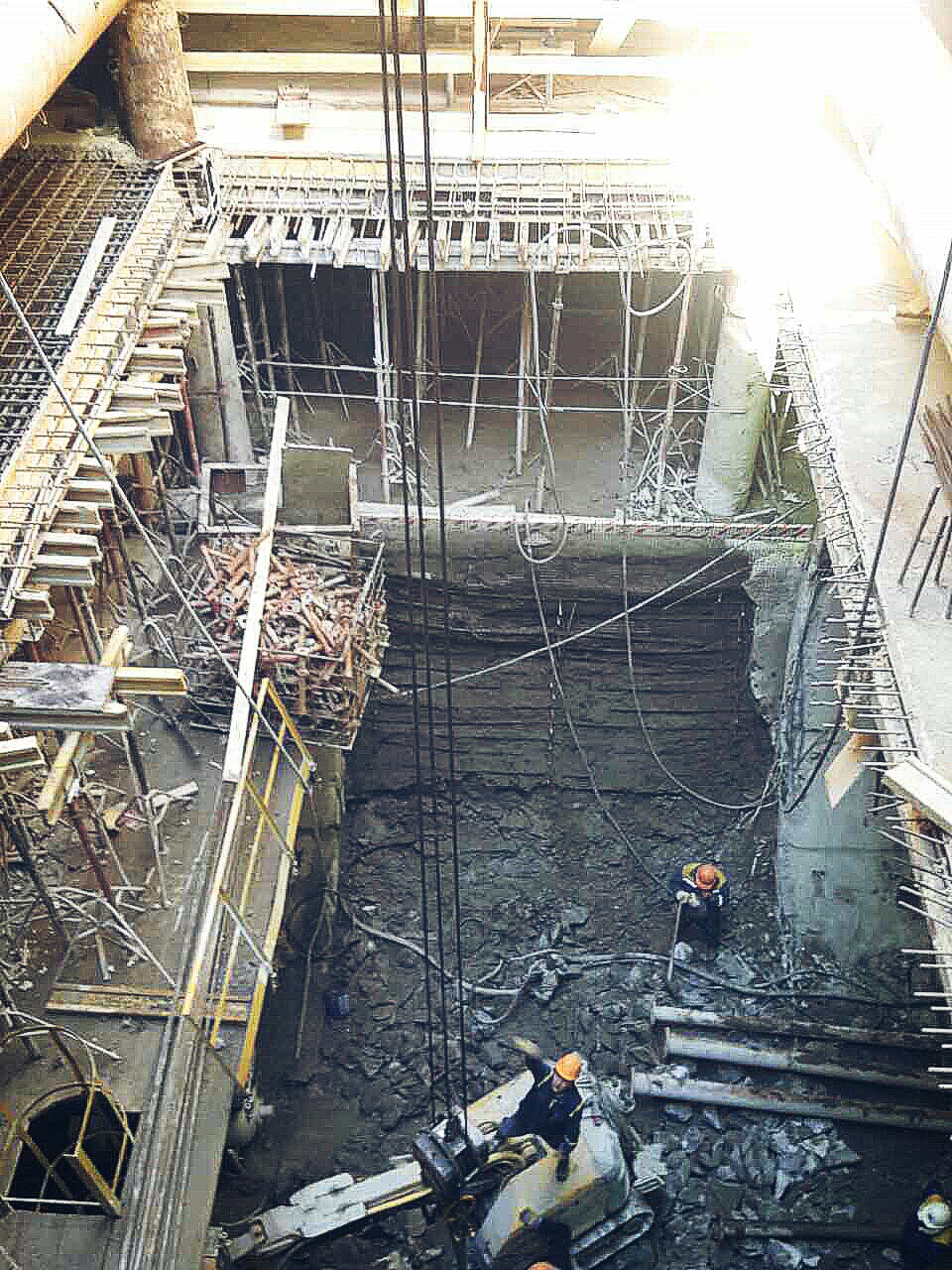 Чтобы ускорить процесс строительства, необходимо максимальное раскрытие фронтов работ. Сейчас мы работаем на всех четырех отметках. Важная составляющая – демонтаж обделки. Для этого включаем все технические возможности: задействуем машину с гидравлическим манипулятором, используем машину с выжимным столом и силовой балкой, демонтируем обделку в осях 1-1’ открытым способом.