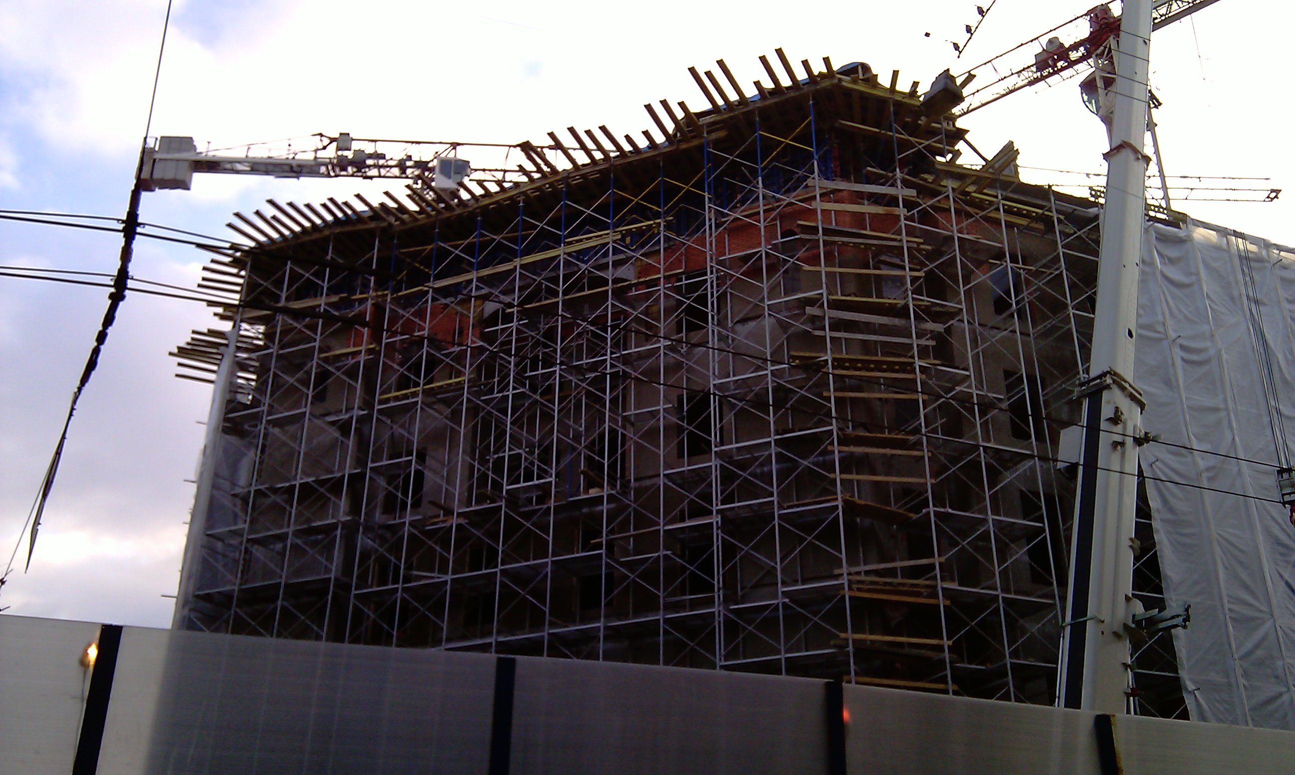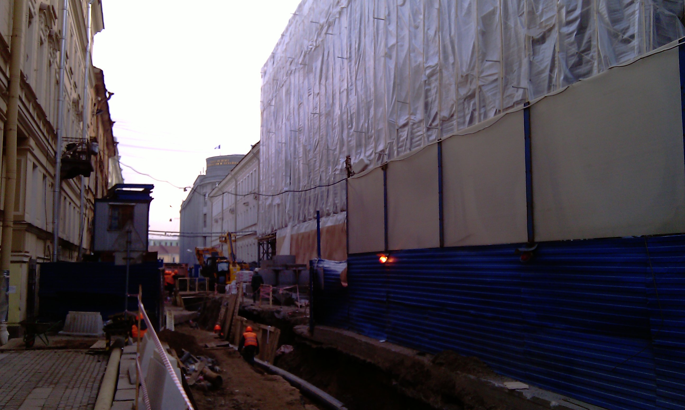 Состояние стройки домика на сегодня. Активность на стройке очень высокая, раскопали кирпичный, штукатурят фасады, активно работают краны, устанавливая опалубку 6-7(???) этажей, где-то в глубине.