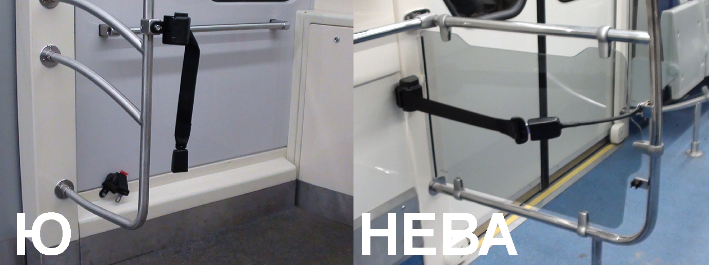 В НеВе есть фиксирующий элемент (фиксатор), а не просто рулон из ремней, как в Юбилейном. Более того, в Ю есть штырь, о который можно порвать себе одежду. В НеВе штырь в самом низу под поручнем, где вероятность зацепиться о него практически нулевая.