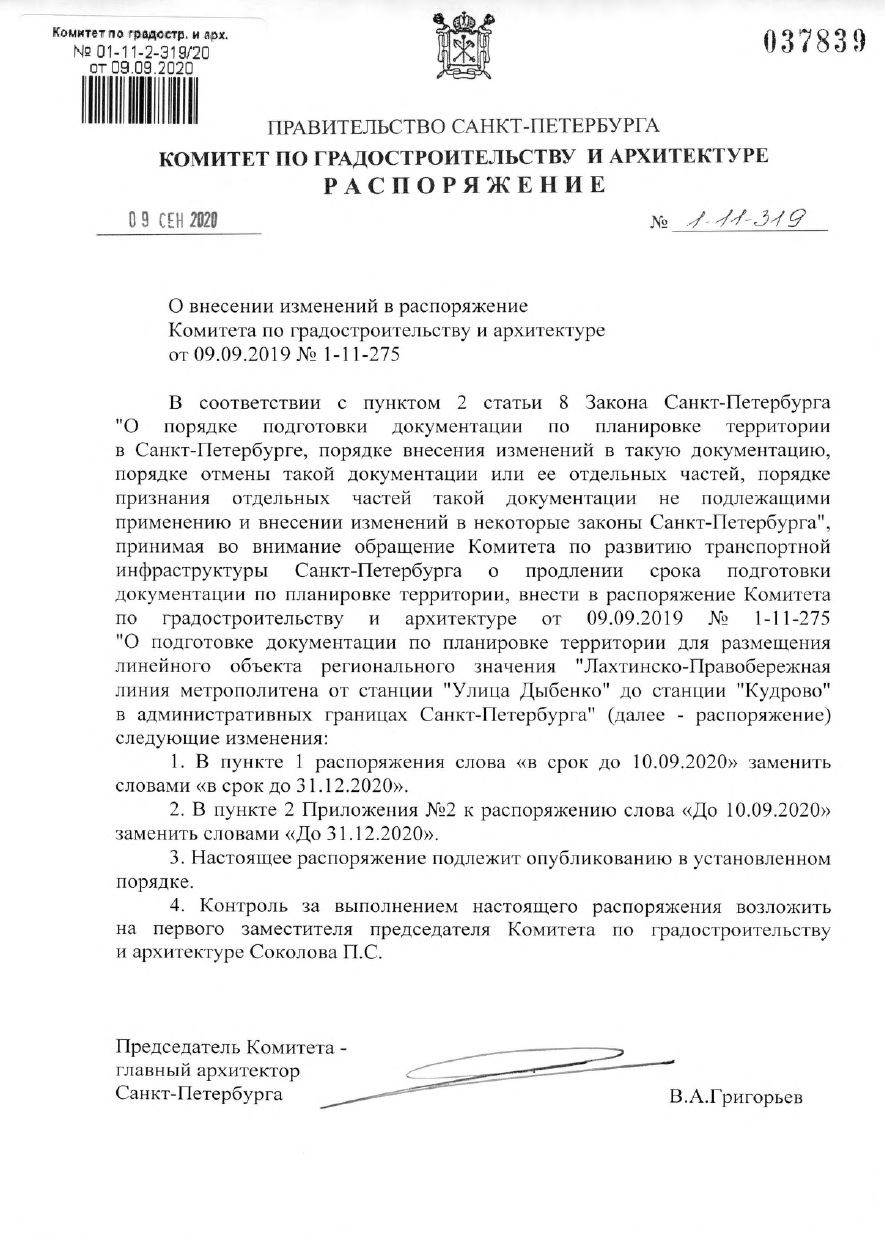 9 сентября 2019 г. подписано распоряжение Комитета по градостроительству и архитектуре № 1-11-275 "О подготовке документации по планировке территории для размещения линейного объекта "Строительство Лахтинско-Правобережной линии метрополитена от станции "Улица Дыбенко" до станции "Кудрово" в административных границах Санкт-Петербурга". Срок подготовки документации по планировке территории - 10.09.2020 г.